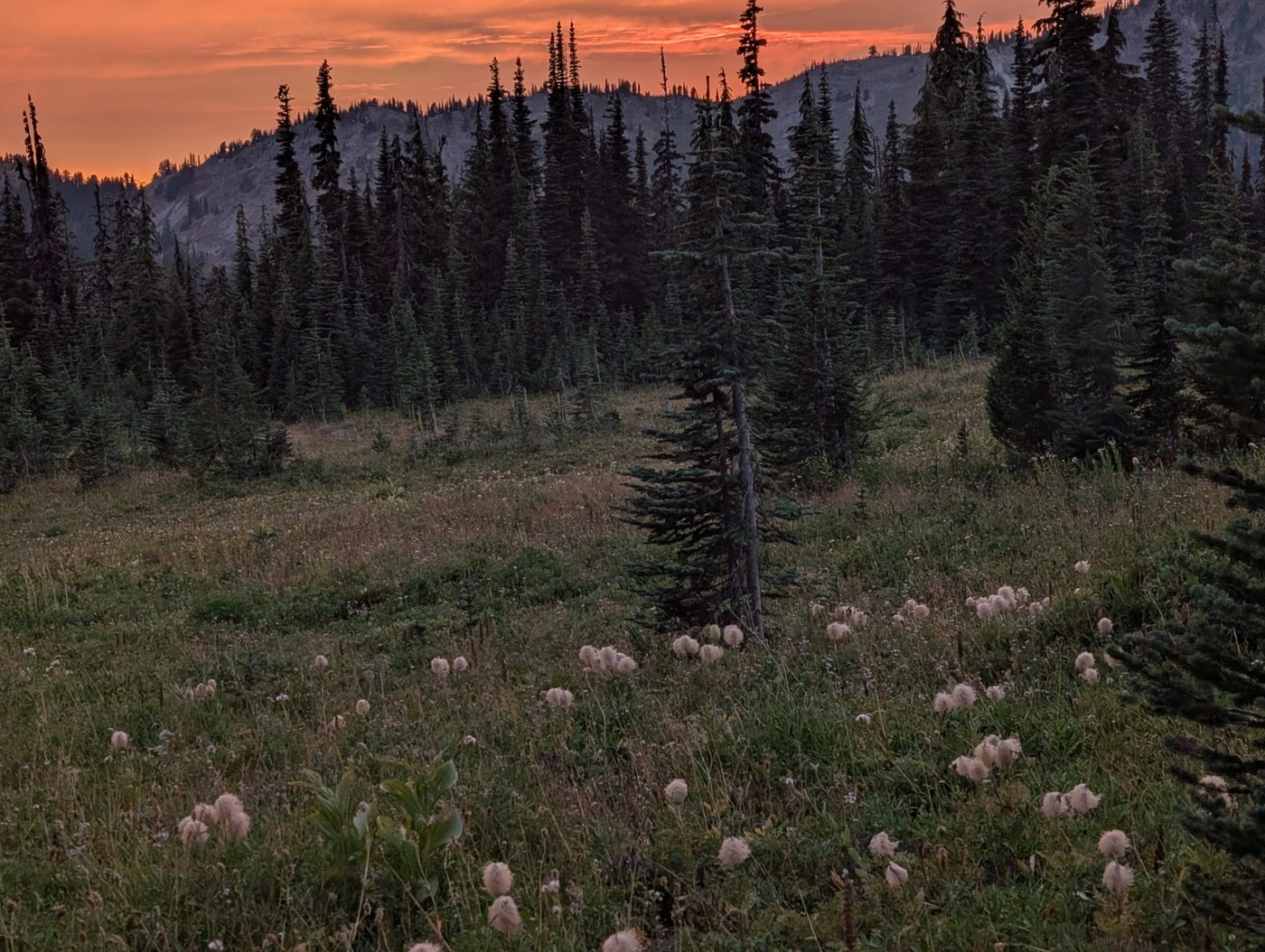 Decided to do an overnight at Snowgrass Flat to kick off Labor Day weekend. I'd read that campsites were plentiful enough that a spot could be found even on a crowded holiday weekend, and this turned out to be both overly optimistic but ultimately true. I got a late start out of Seattle so it was midafternoon by the time I started up the trail, so definitely bad planning on my part. There are three or four sketchy spots with slanted surfaces just off the main trail, and then a maze of side trails to campsites up near the junction with Lily Basin Trail, but all of them were occupied. I searched both Lily Basin and Snowgrass Flat for a site for some time, but ultimately someone recommended that I just set up where her group had their camp chairs, right at the junction. It was definitely an established site but also super exposed to everyone hiking either trail. Still, it was almost dark so I took her recommendation. As I was setting up I overheard one of the camp chair people wishing for some cheese, so I offered her some of mine. She was very appreciative, and her friend said "the trail provides" and we all had a good laugh. Now, as it happened, I had borrowed a tent for this trip. It's the Big Agnes Copper Spur, which is super light and which doubtless many readers are familiar with, but I had only partially set it up once. I was figuring it out, but it was slow going and getting dark, so ultimately my cheese friend asked how it was going and I asked if I was doing it right. She took a look and said yes, so far so good, but then gave me so many helpful hints that I feel like she basically set it up for me. She said it was in return for the cheese, but I definitely got the better end of that barter. The trail provides, indeed.
