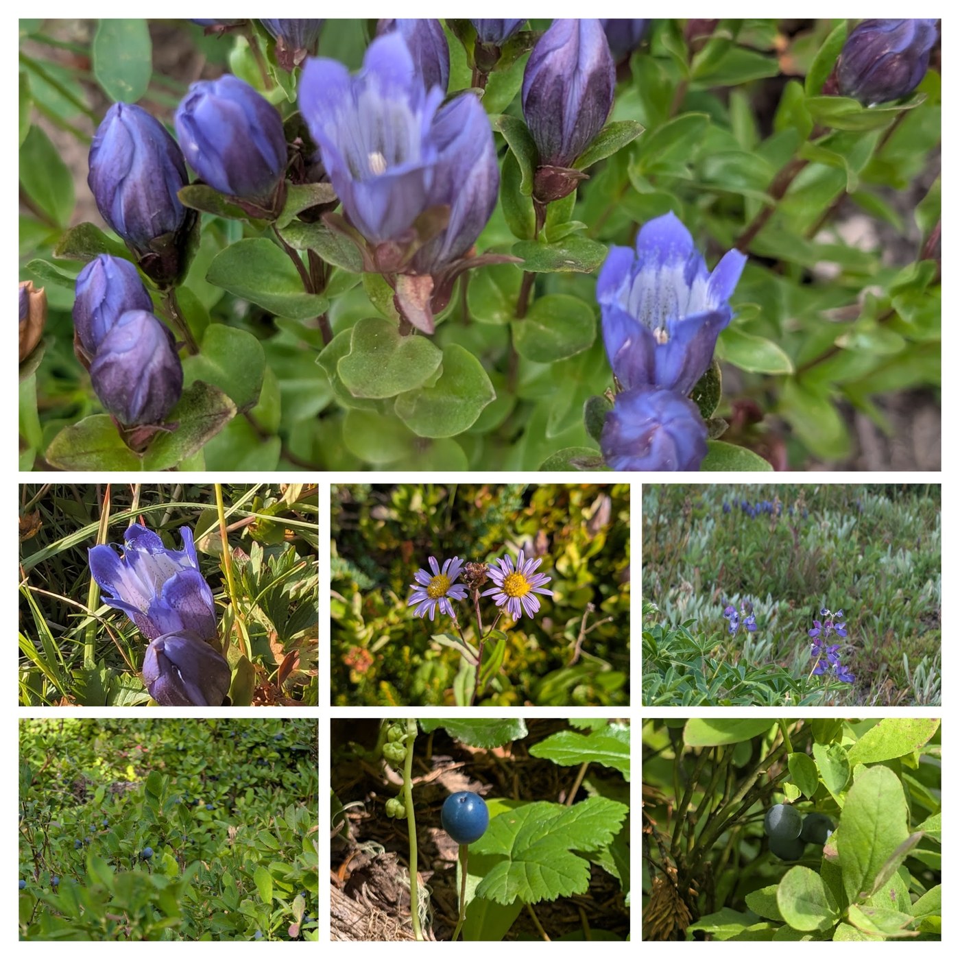 The flowers, which are the big draw of Snowgrass Flat, are definitely past peak. The purple asters are waning but still nice, and the paintbrush is still going strong. The blue gentian, a flower I just learned a few weeks ago at Snow Lake, is everywhere and appears to be just about at peak... such an intense blue! And of course, the Cascade blueberries are about at peak ripeness and flavor. Along with some straggling lupine and a weird blue fruit that is not a blueberry, the late season seems to be ruled by blues and purples. There were a few blueberry bushes that were already starting to turn red, though. I am not ready for summer to be over!