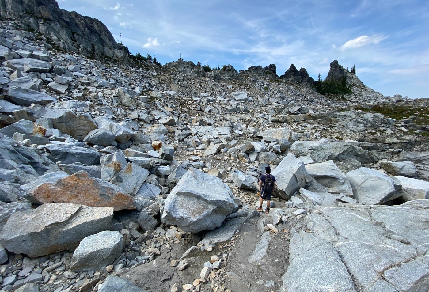Once we reached Trap Pass and departed the PCT it of course got more difficult. Having been here a few times we knew what we were in for and this time it was easier. Prior trips had some snow remaining in the ~3 gullies but not so this time. No snow left at all, making it faster but not easier to traverse them. Braided bootpaths abound, just make sure you're not stepping on any plants.