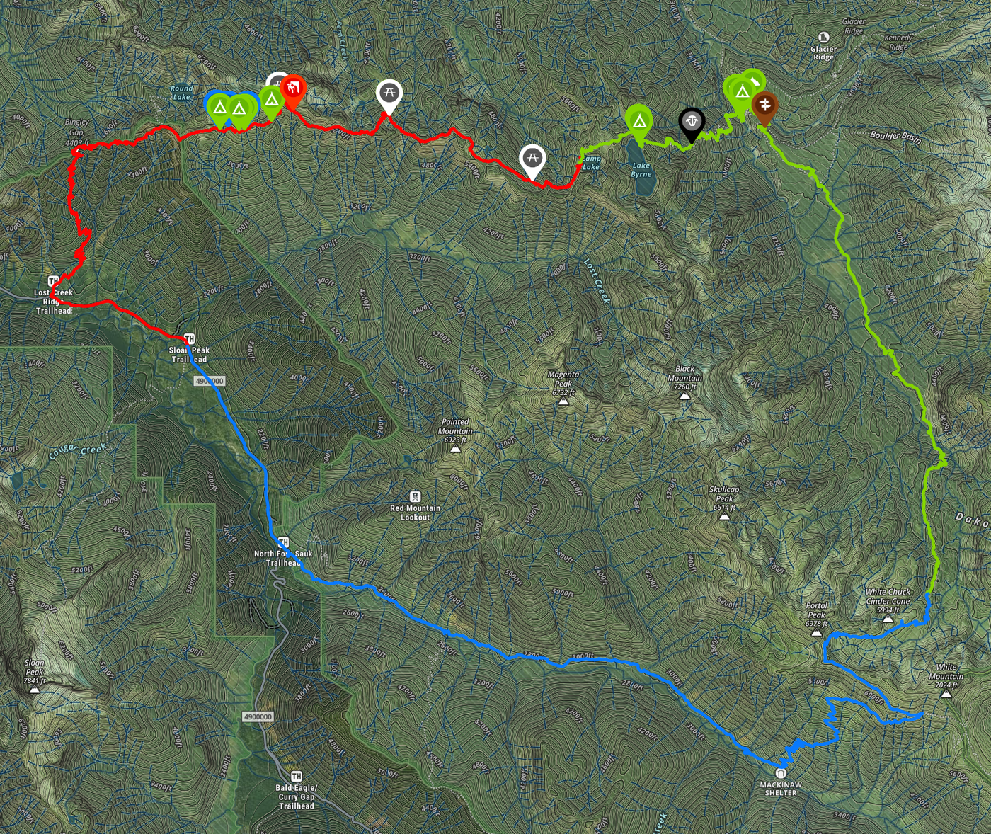 - Day 3: PCT Glacier Meadows -> Red Pass -> North Fork Sauk Trail -> Mackinaw Shelter -> North Fork Sauk Trailhead -> Sloan Peak Trailhead (15 miles w/ 1600ft gain and 5140ft loss)