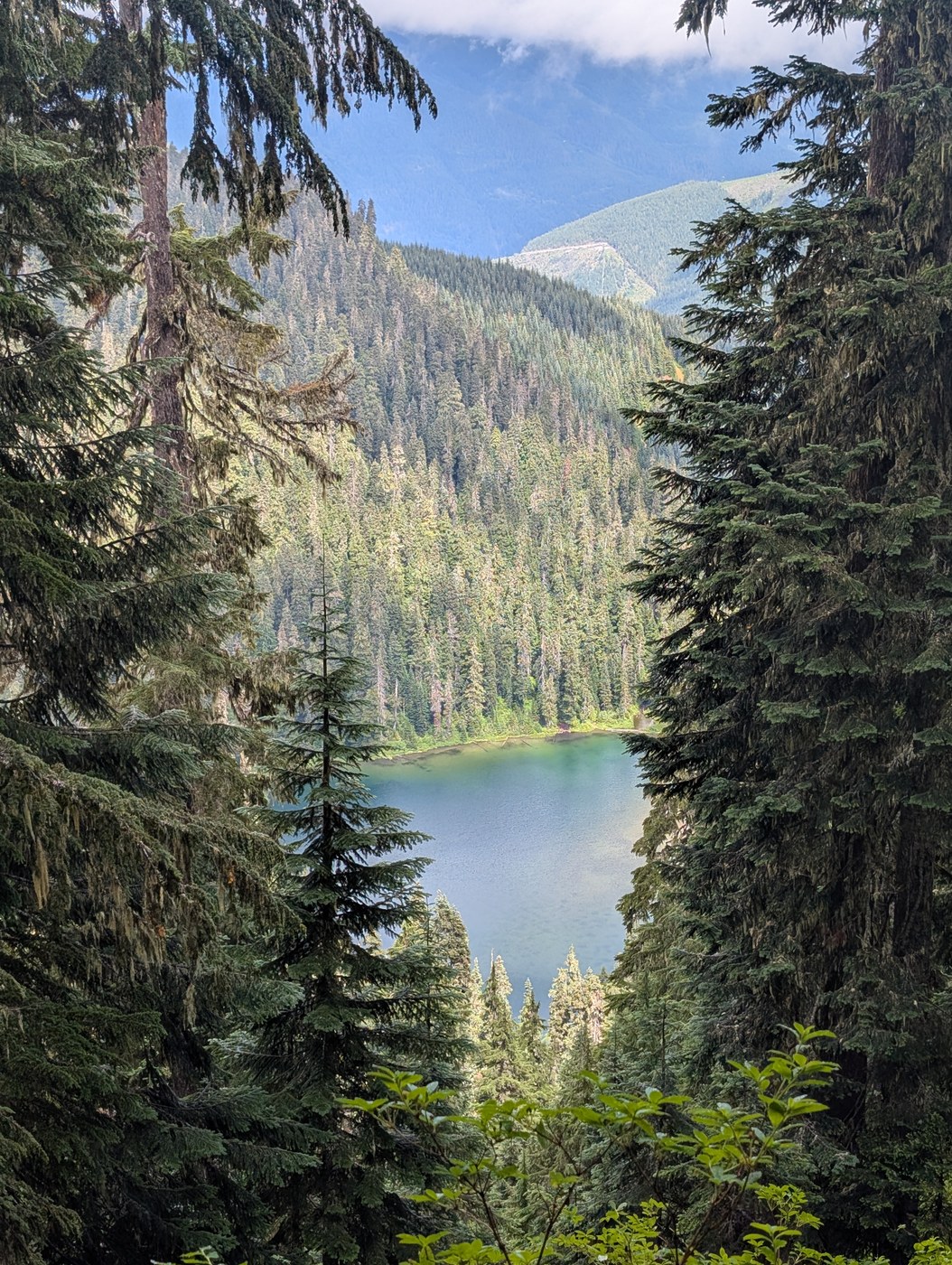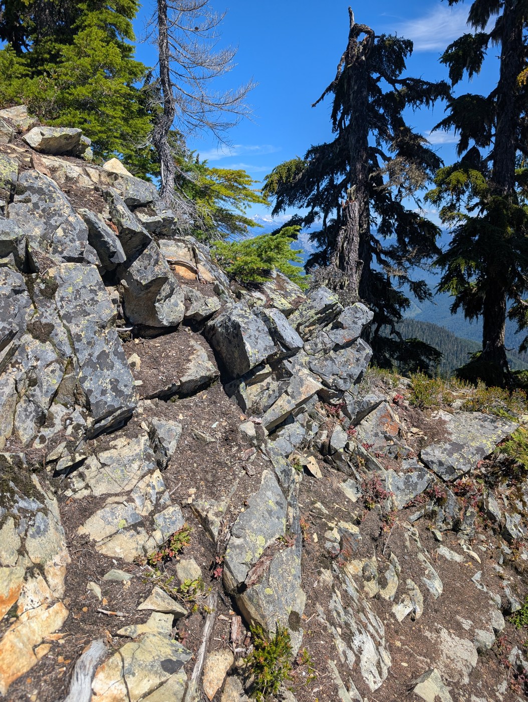 The scramble goes right over this minor peak and is solid rock, steep, and has few foot/hand-holds. I'm not afraid of heights but this gave me some butterflies. On the way to the lake I avoided the scramble, but that put me on a very steep traverse that was probably more dangerous. IIRC, there are some logs blocking that path.