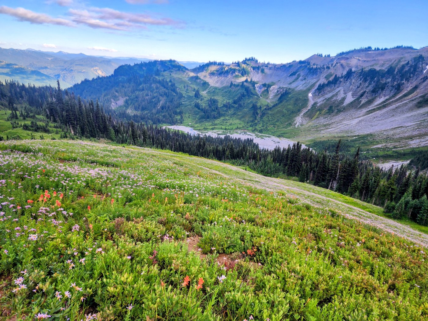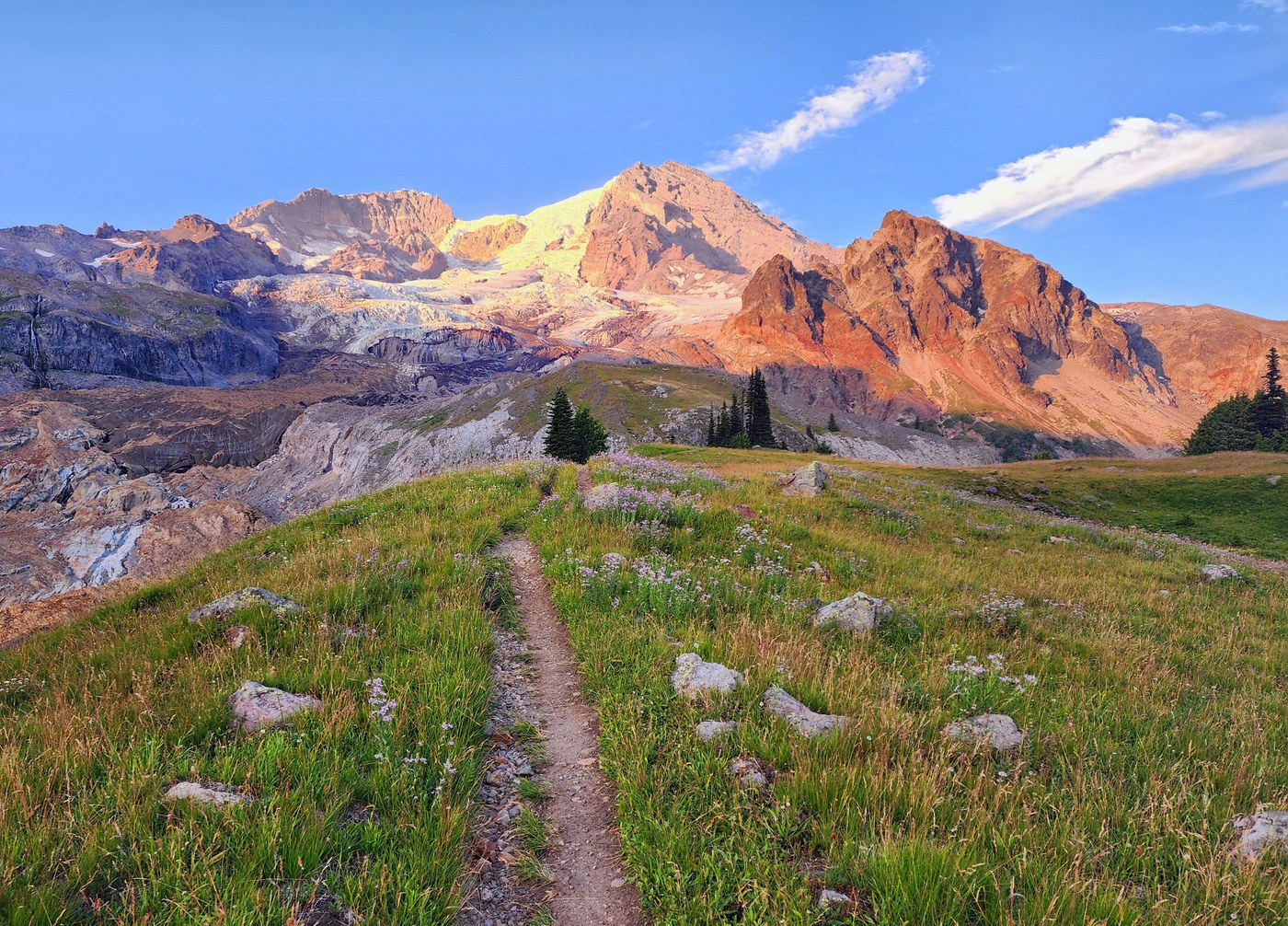 Aloha...Group of 8 from 18 to 71 set out on a beautiful day from White River to Indian Bar...11.3 miles. We did the trip in 2021 counterclockwise, this year, clockwise. Log bridge in over White River and pleasant walk up Frying Pan creek valley. Once the bridge is crossed over the creek, up some switchbacks to Summerland. Great view but little busy with daytrippers. Then basically up 1000 feet in 1.4 miles to Panhandle Gap. We took the low route up the final ascent to gap thru talus/muck because there was still a dicey snow/ice field on trail near the top. Clear day, great views and a wonderful ramble thru the alpine slopes...goat herd off to the east grazing. Great views of Adams and Goat Rocks and then down to Indian Bar. Absolutely one of the best campsites in the PNW if you are in the shelter. New bridge just built over the river/falls.Aug 21 Indian Bar to Maple Creek...9.8 miles. The climb up from IB to point 5930 is well constructed with great views behind,front and all around. A reason for this trail to be called Wonderland. Then its down over 4 to 5 benches, thru the forest, past Box Canyon and up the creek to Maple Creek camp. Treed but ok. Aug 22 Maple Creek to Longmire..10.2 miles. This day is marked by waterfalls, forest walk, Reflection Lake and many daytrippers enjoying the trail/experience. There is still the washout up from MC camp, follow flags/cairns thru rockfield and up and down back to trail...probably .25 mile. We love staying at Longmire, food, comfort and shower...highly recommend! Aug 23 Longmire to South Puyallup...12.7 miles. Highlight of this area is Emerald Ridge...linger there. I was able to hike thru during sunset, sublime colors. Took Rampart Ridge up from Longmire and the cruised the ridge, then up and down over creeks, washout,suspension bridge and then up the ridge to Emerald. South Puyallup is very nice camp but had to get water .25 up trail from camp. Aug 24 SP to North Puyallup camp...7.5 miles. Highlight of day is spending time at St Andrews lake and the ridge walk to it. Saw several bears in this area, even little BooBoo grazing on berries. But the lake is such a great place to take off the pack, dip into the lake,lunch, and just reflect the mountain. Then off to NP camp, great camp on the old road, rock wall to sit on ....favorite treed camp. Aug 25 NP to Mowich Lake...15.9 miles, ugh for 71 year old knees. Beautiful walk to Golden Lakes, more bears. Then off to the 40+ switchbacks down to the Mowich....thank you to NPS for flagging, logs,cairns...easy to follow and get thru the Mowich maze. Then up, not a favorite climb, trail ok but just a darker forest climb. One advantage is Mowich is only a backpacker camp now, lot quieter. Aug 26 Mowich to Mystic Lake..13.3 miles. We took the Spray Park trail, Spray Park goes thru several benches, great views especially early in the morning. After summiting the ridge it is down but very interesting with different views,benches,streams all the way down to Carbon River. The mile up to Dicks Creek Camp is one of the hardest especially in the 80 degree afternoon sun. After that it is up but in forest eventually opening up to Moraine Park. Another delightful are that I passed thru at sunset, great colors. Then up over ridge and dropping into Mystic Lake area. Long day but the last part is great. Mystic camp is in trees but water close by. Aug 27 ML to Berkeley Park...8.3 miles. Down past Winthrop Glacier...WOW...then up to Skyscraper Mtn....Views! Then around the corner to the basin that leads down to BP, great camp. Off the beaten path, but near the babbling brook. Aug 28...BP to Sunrise...4 miles. Up early to catch the sunrise, coming up out of the park...face to face with Mr Goat and 40 of his pals. some were still sleeping in but most were grazing. Great walk up and around to Sunrise.