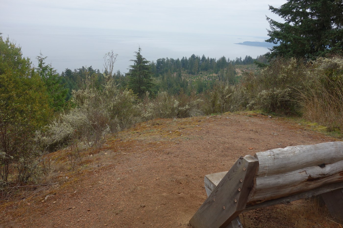 We recommend going counter-clockwise. After the first short stretch from the parking area, when you come to the junction, go right, up Bunker Ridge trail. It's steep; you'll get a nice workout. You can take a short rest at the first view point, where there's a bench and a high round table with stools. Continue up, past the entrance to the WWII mine, cross the road and continue up, up the Peak Spur Trail. Turn right at the first turn, and find that nice bench where you can enjoy lunch, with a nice view of Canada (unless there's cloud cover, like we had). Then continue on around, and enjoy the views south and west towards the Olympic peninsula. The trail isn't too steep as you continue to wind your way down and around, ending at the Cove trail before heading back to the parking area. It's shady most of the way, except at the top. The rain in the forecast never materialized, although mists over water prevented us from seeing much north.