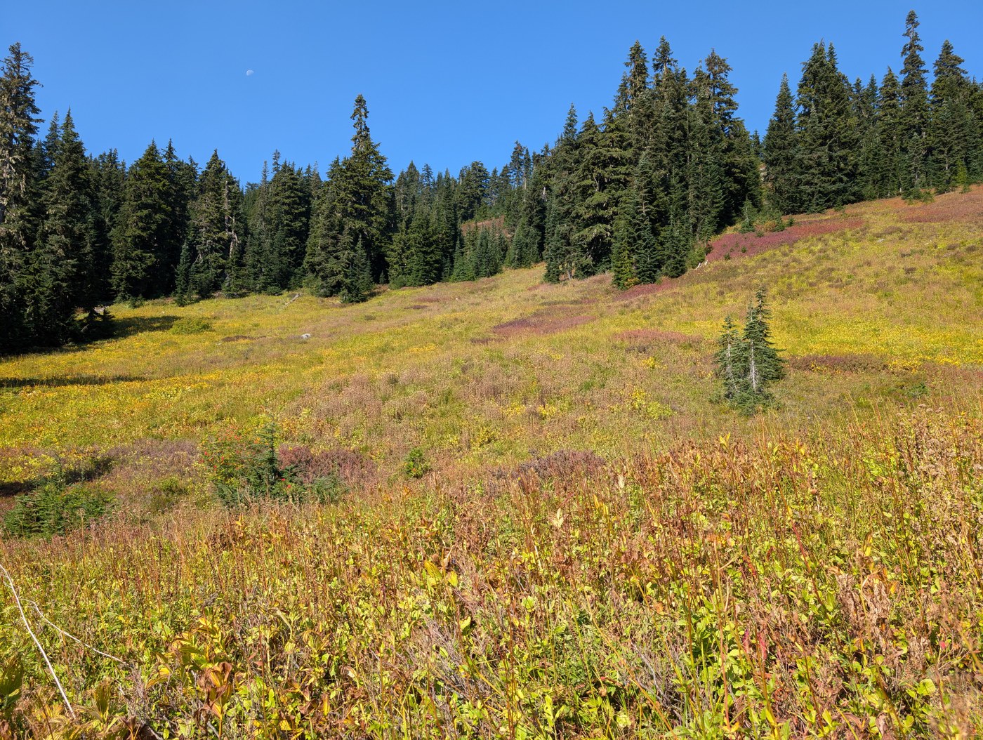 The trail to Hope Lake is through dense forest, rocky and rooty in many parts. After Hope Lake the PCT takes you up to Trap Pass. The tread on the PCT is mostly soft, and most parts do not have much elevation gain, and in some places you go downhill. You pass through open hillsides and get a view of Nimbus mountain, where you are headed. There are still a few trickles in the streams here, and also a few campsites visible from the trail. Mountain ash and the blueberry bushes are turning and they, along with the white rhododendron bushes will be beautiful in a couple weeks. This seems like it will be a great fall color hike, while everyone else goes to the North Cascades. The berry bushes were also loaded with sweet and plump berries.