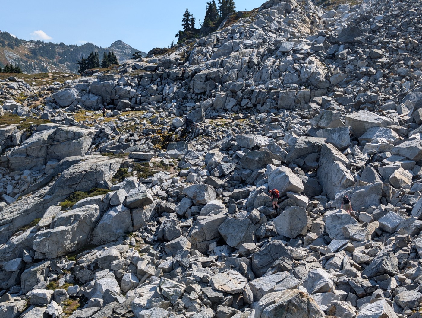 Leaving from Trap pass, a couple narrow sections with slides, not too sketchy but needed some focus. Then uphill through some trees to the first boulder field. The first one was the most difficult, the others were quite OK to navigate.