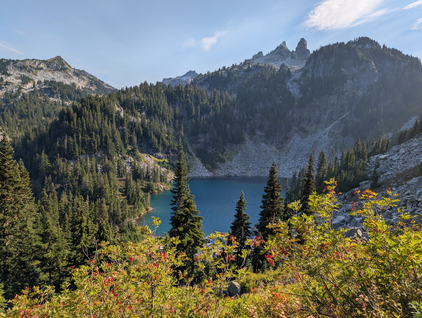 The lake was beautiful, Mt. Stuart in the distant was barely visible through the haze, but Mt. Hinman and Mt. Daniel were clearer. Quite a few backpackers coming in and looking for camping sites here. A few hikers were also making their way up Nimbus mountain. I did not go to the lower lake, but that would be another place to explore if you have more time/energy here.