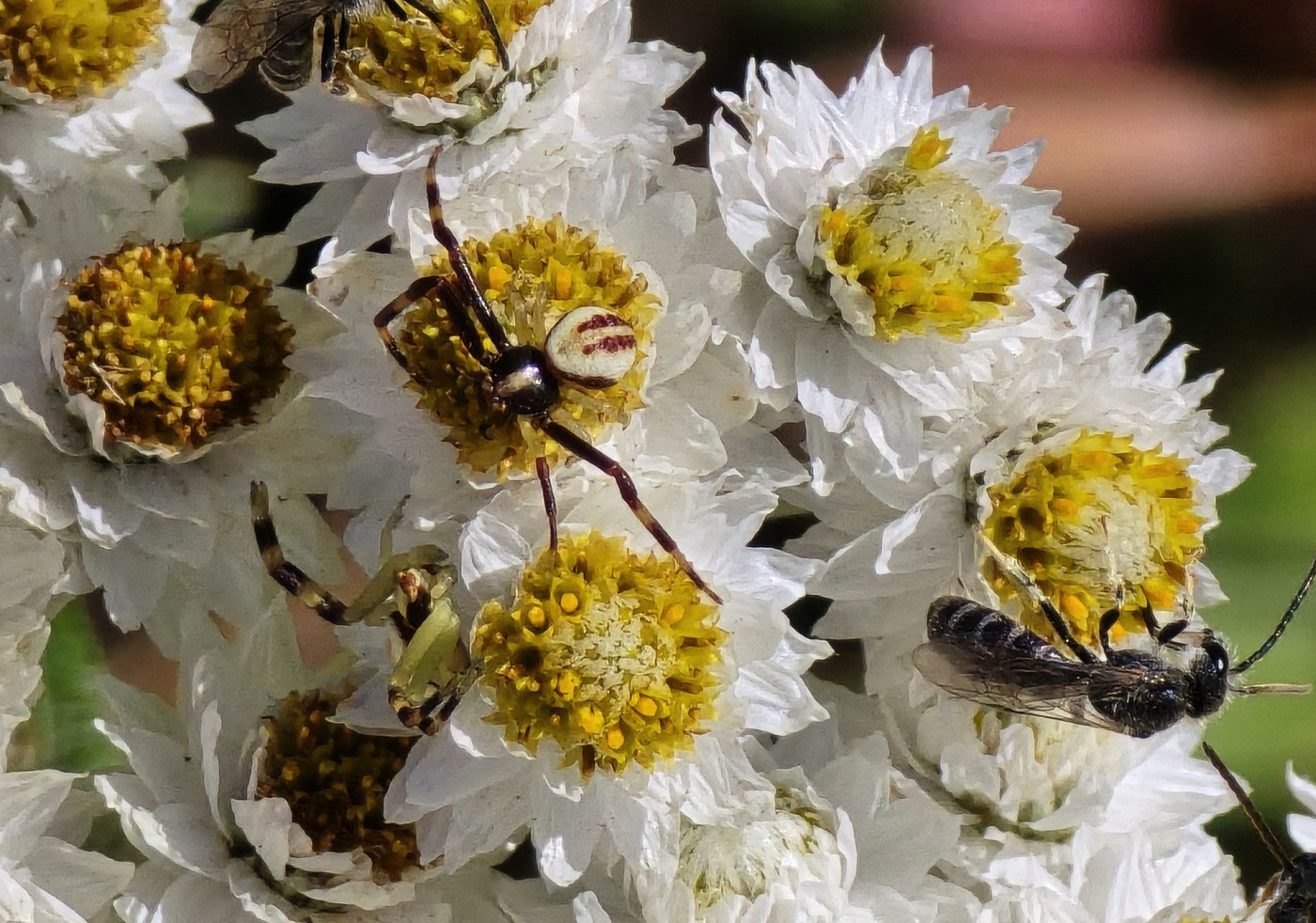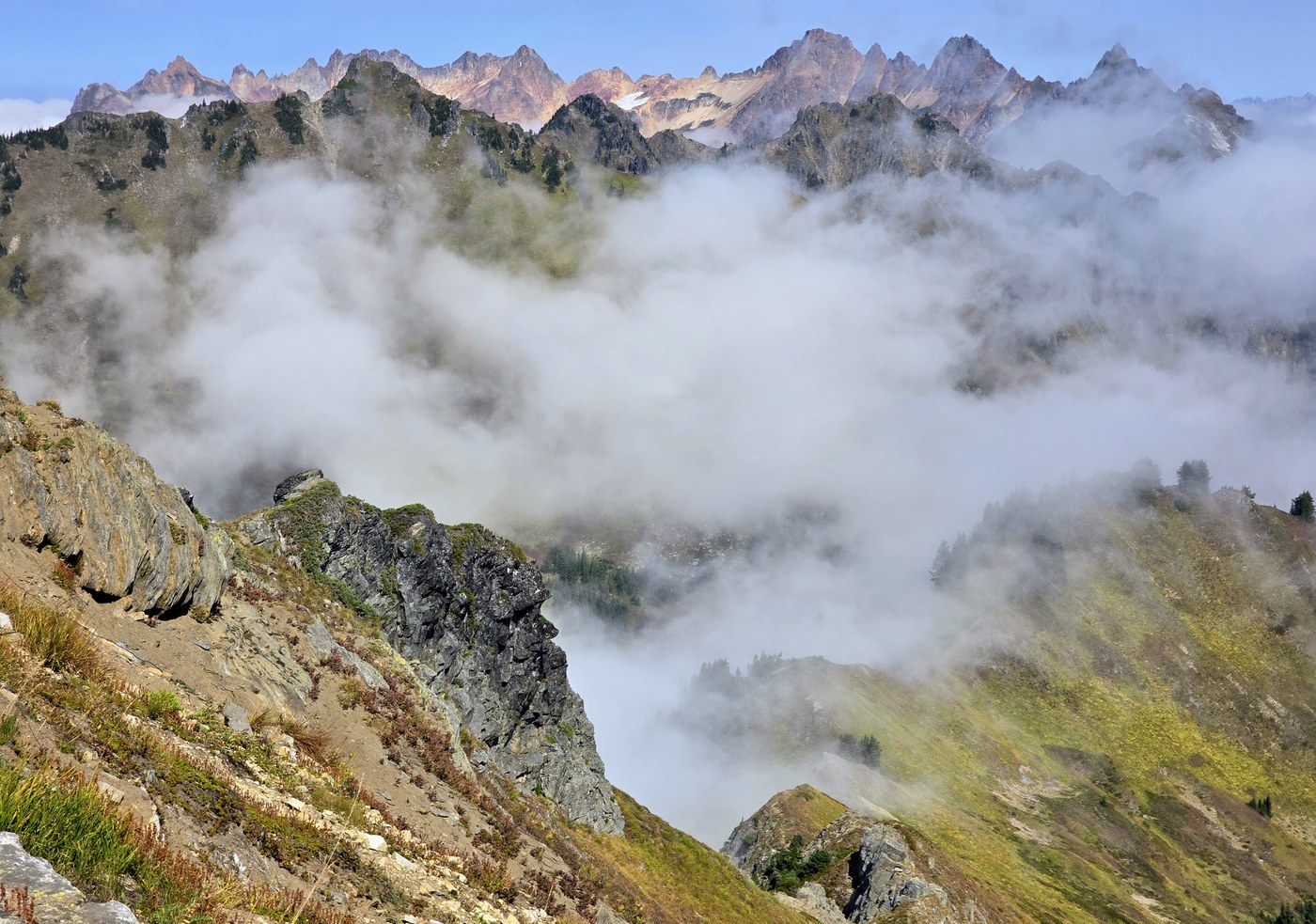 A group of 4 headed up to the lookout at 9:30. We saw 2 groups of unsuccessful hunters (bear) coming down in the first mile. On entering the meadows we could see why they had traveled so far to hunt here, there were more blueberries than I have ever seen (photo 1, this was not the thickest clump, once I got 9 berries with one grab). The mountain ash and white rhododendrons are just starting to turn, but many of the berries are in full color (photo 2) and some a little past. The views are outstanding (photo 3). The few flowers (pearly everlasting, harebell, asters, goldenrod) that were blooming had many pollinators and a few crab spiders on them (photo 4). On the lower sections, the bracken ferns and thimbleberry are very thick and colorful. The trail is in great shape. A nice feature is that you only spend a mile in the woods and the tread is gradual and often soft with duff (I think western hemlocks above tend to produce a soft tread below). Both the Suiattle River road and the 5 miles of the Green Mt Road are in pretty good shape with occasional potholes, some fairly large embedded rocks, and a few 3 inch or so loose rocks. Any car could make the journey. We saw many berries, birds, and other animals, thanks Paul for the list below!