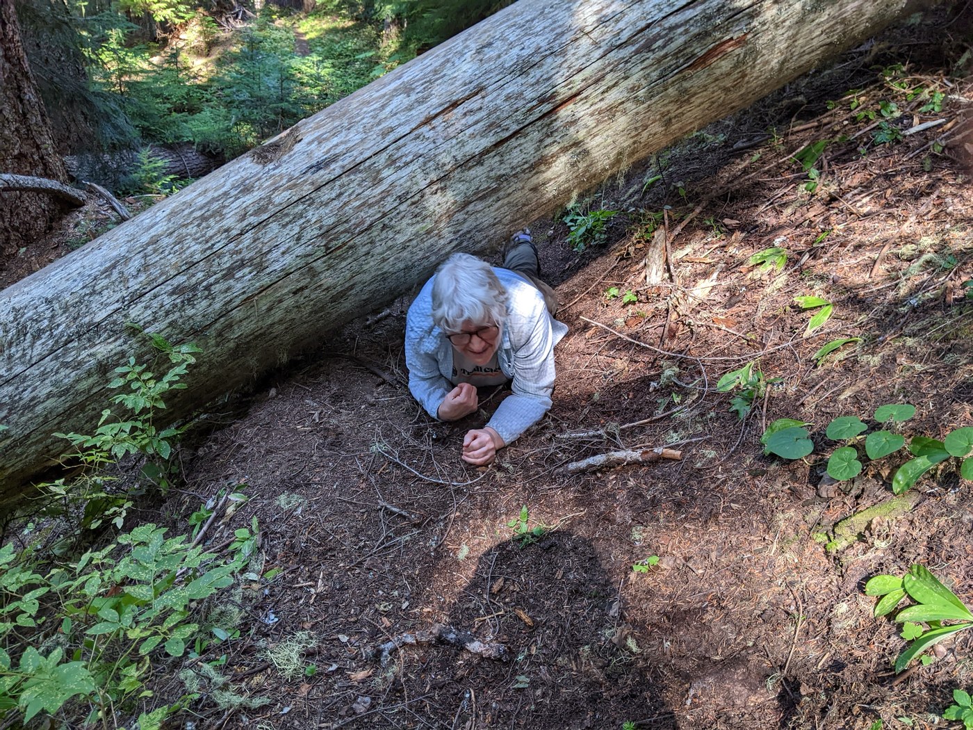 On the one-mile connector trail, from the Deception Creek trail to the PCT, we came to a log across the trail. The log was a little slippery, and we did not want to risk slipping and falling. So we took the low route. There were not other obstacles on the connector trail.