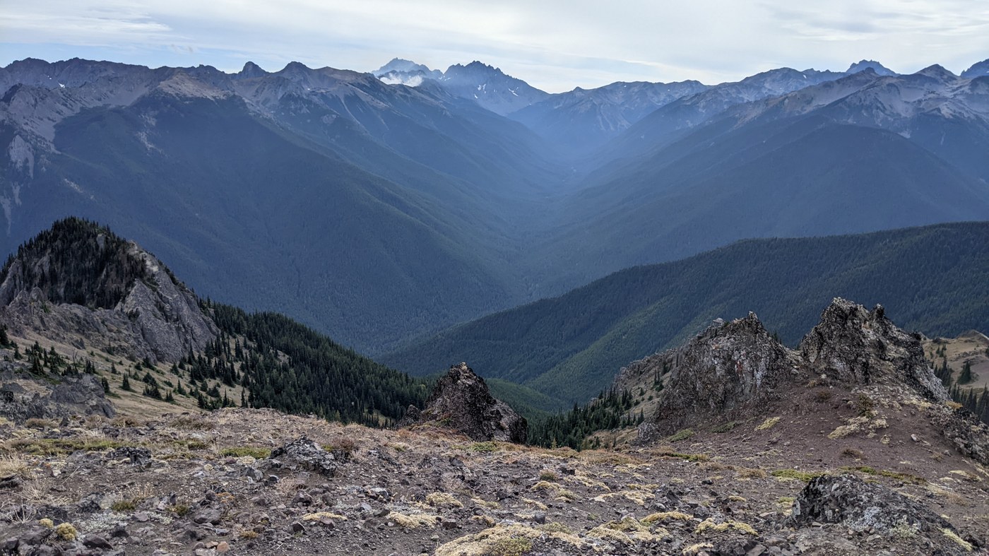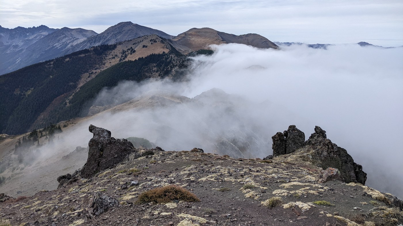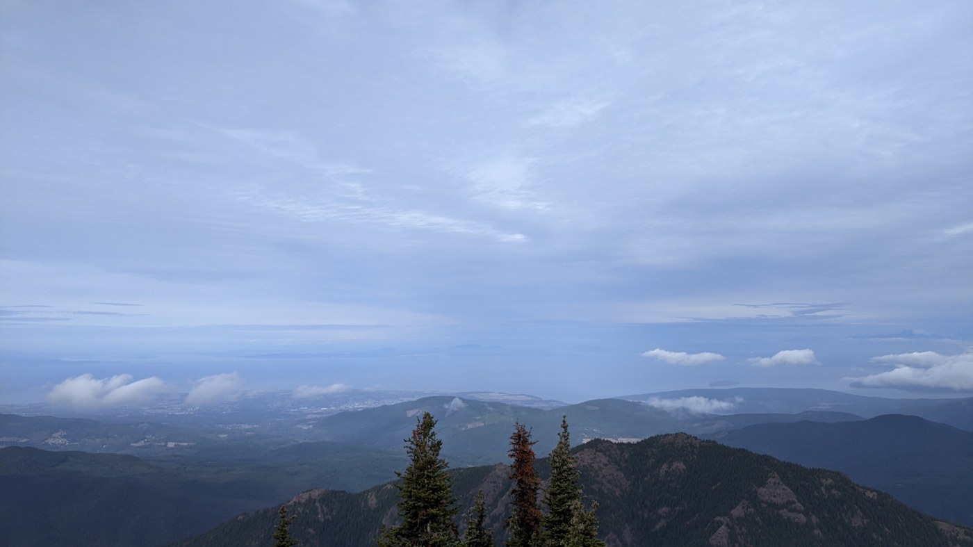 VIEWS. Not the best day! Plenty of mist and haze. As I rolled into the peak, so did the fog bank. The great views east, north and northwest were mostly left to imagination. Regional views, very nice.