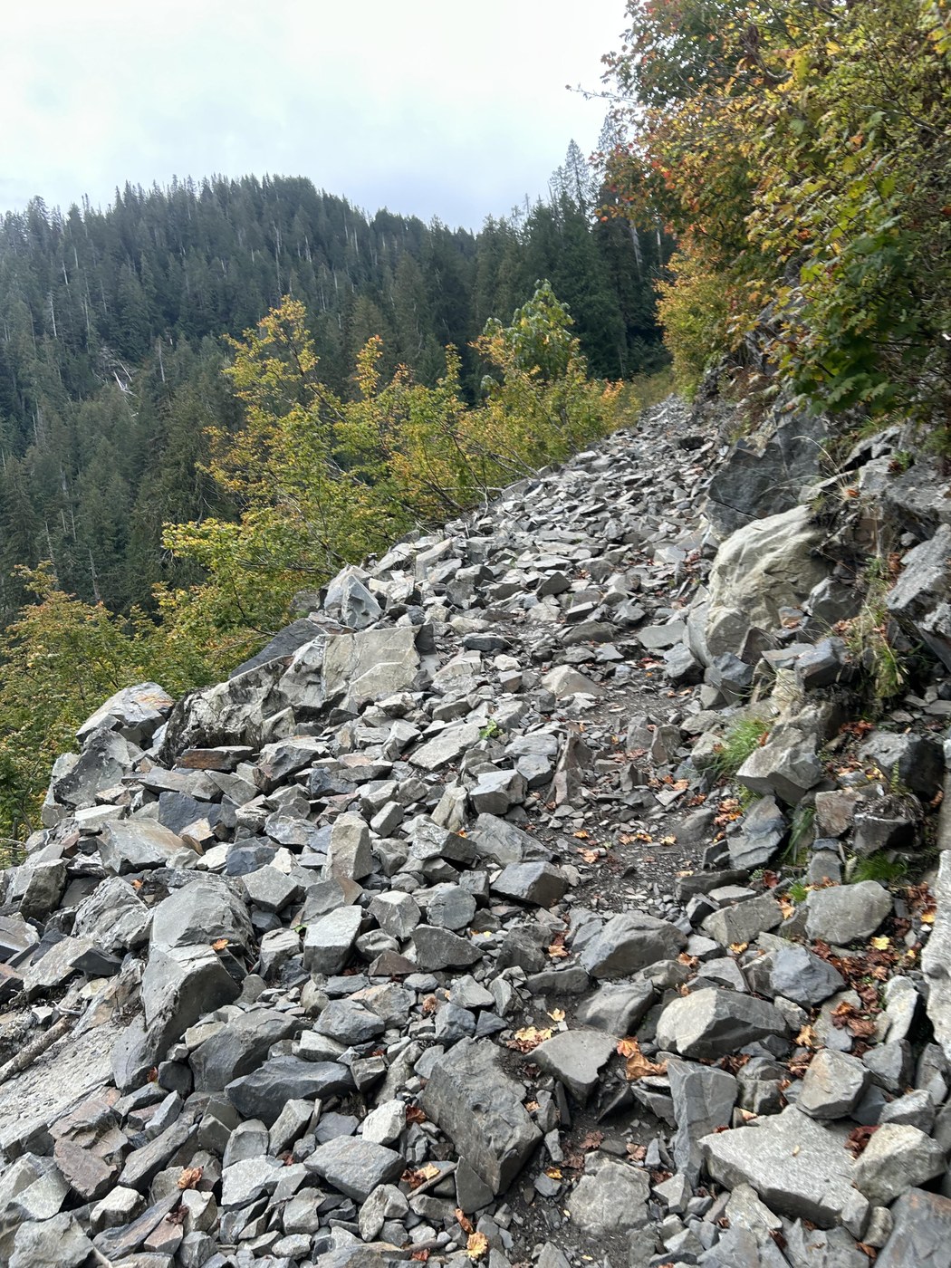 I think the most difficult section is more than half-way in where the trail comes out of the forest into an avalanche chute. The trail has several switchbacks and a trail made up of large gravel-type rock. The trail climbs a lot during these switch backs.
