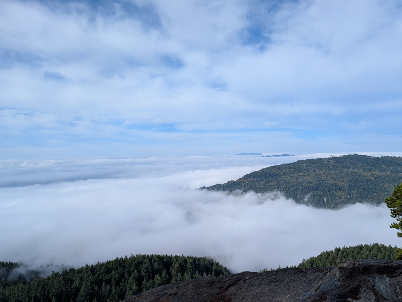 The hike itself was uneventful - not too steep, well maintained, and easy to follow. We topped out a little before 10:30 and were greeted with a great view of the fog smothering the Sound and farmland. Oh well.