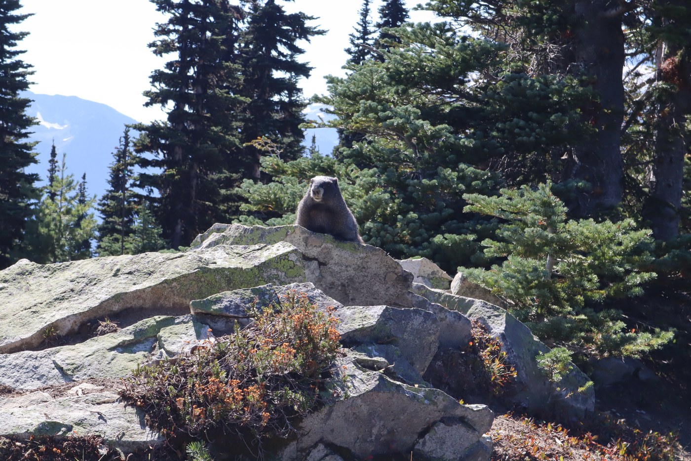 Many times, I had done hikes out of Sunrise, always to the left-hand side toward the Mountain, and the interchange of trails there. This time my hiking companions and I took a right above the parking lot at Sunrise and hiked the ridge trail above the road to Dege Peak and out to Sunrise Point. A beautiful clear and fairly warm end of summer day. Arrived at the lot at about 10:30 after an almost three-hour drive of detours due to the Buckley Bridge not being accessible. Dry and often exposed trail looking down on the Sunrise Road, then the short left-hand trail up to the summit of Dege (7,008 feet), with a commanding view of the surrounding area--the valleys on the opposite side, Sunrise Lake, and Sunrise Point in the distance. Way off to the other side, Grand Park. We stayed on the summit for an hour, then continued along the ridge, which descends down to the parking/viewpoint area of Sunrise Point. Then the climb back up to the Dege junction! Returned to the parking lot at 2:30. Miles: 6.2; Wildlife: gray jays, marmots, chipmunks.