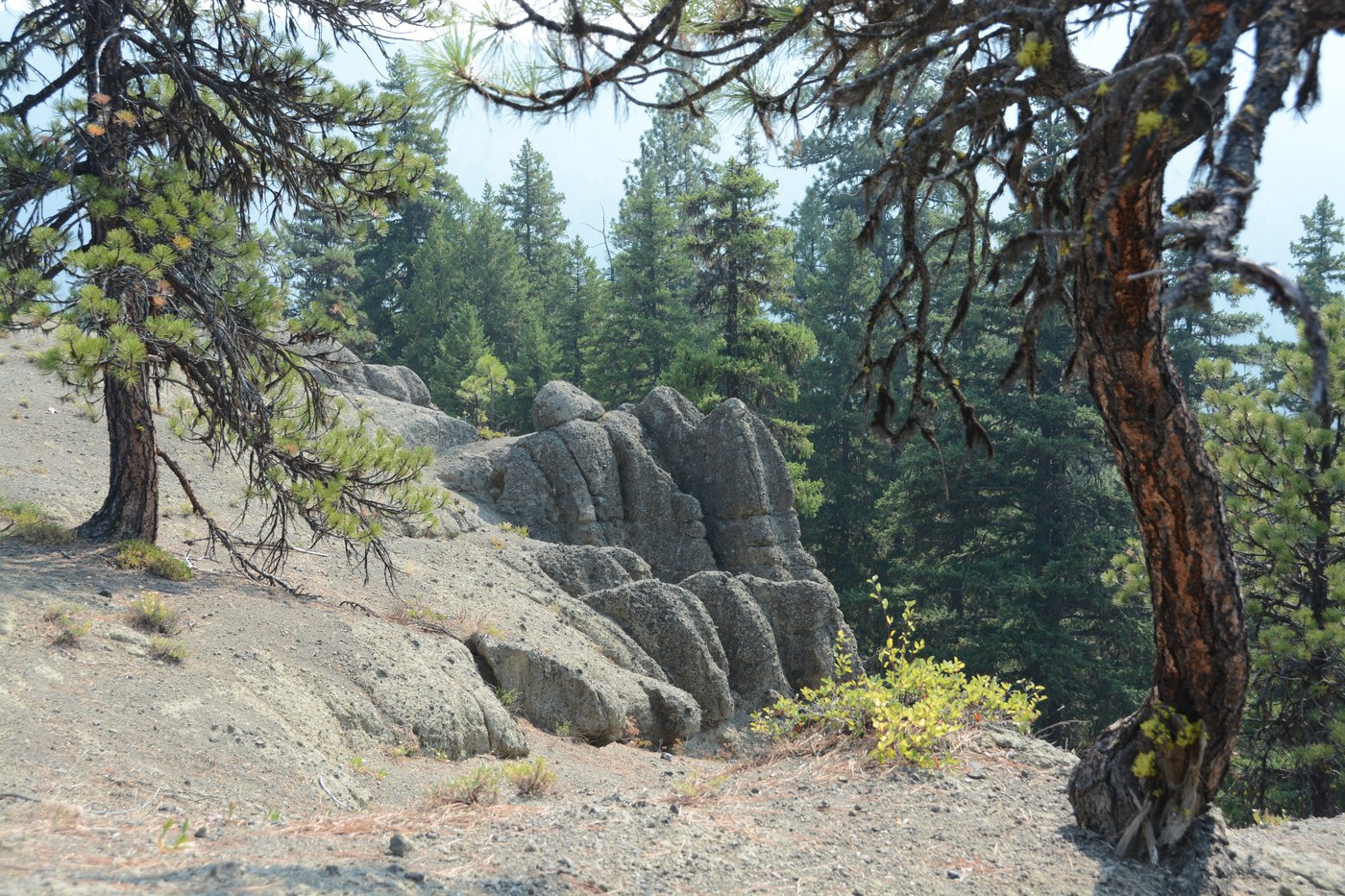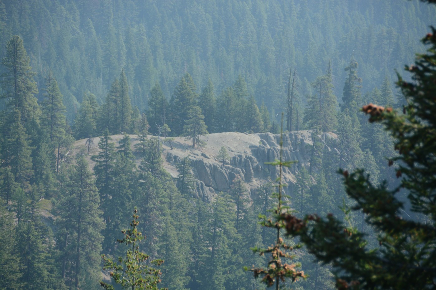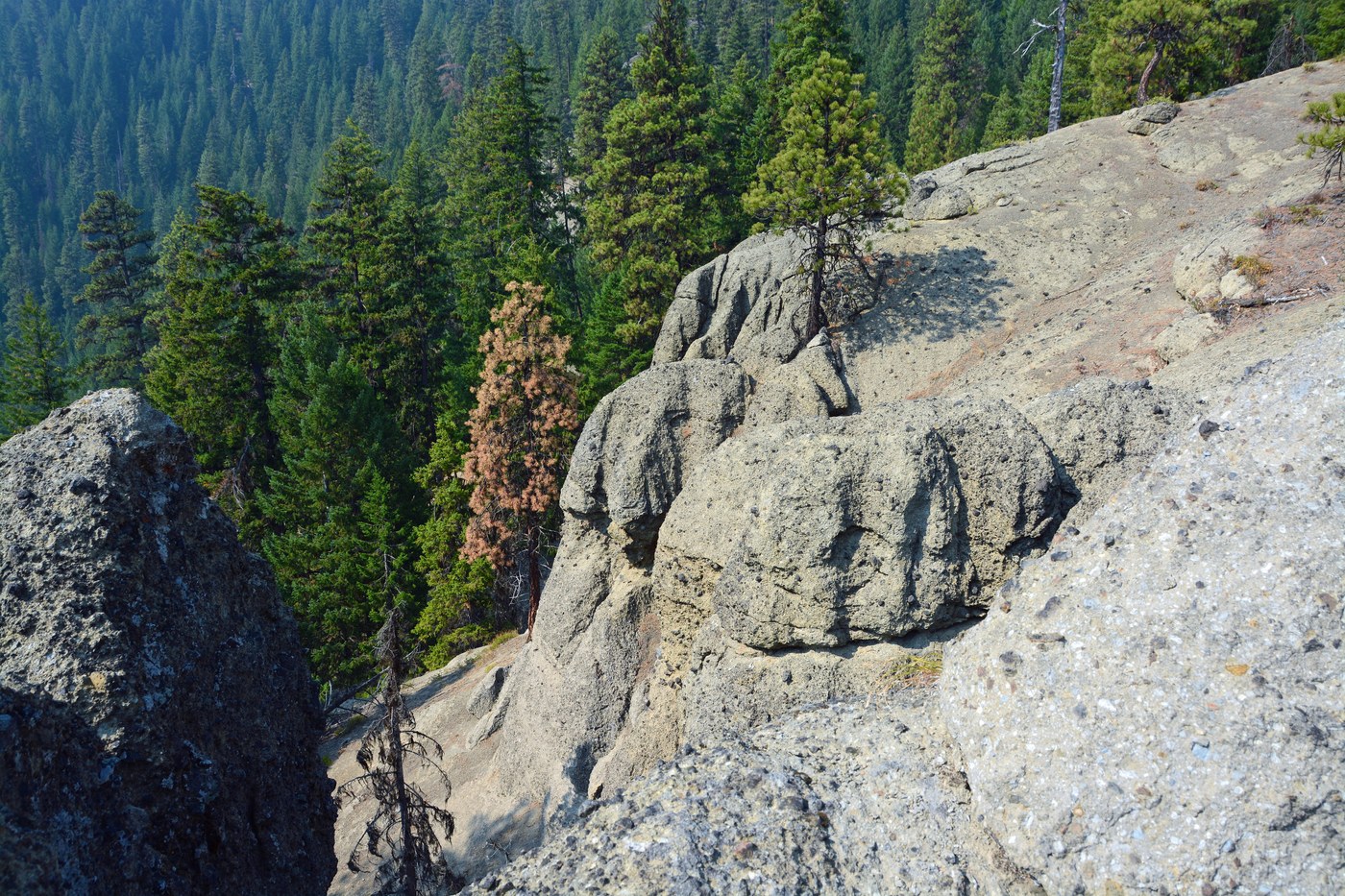 The rock formation at 1.3 miles fascinated me. I spent some time angling for photographs. When I continued on to the junction with the West Quartz Creek loop, there was ample evidence of logging there. Many slash piles remained. I couldn’t help but think of the Bumping Lake fire and how those slash piles would just fuel a fire if one came this way.