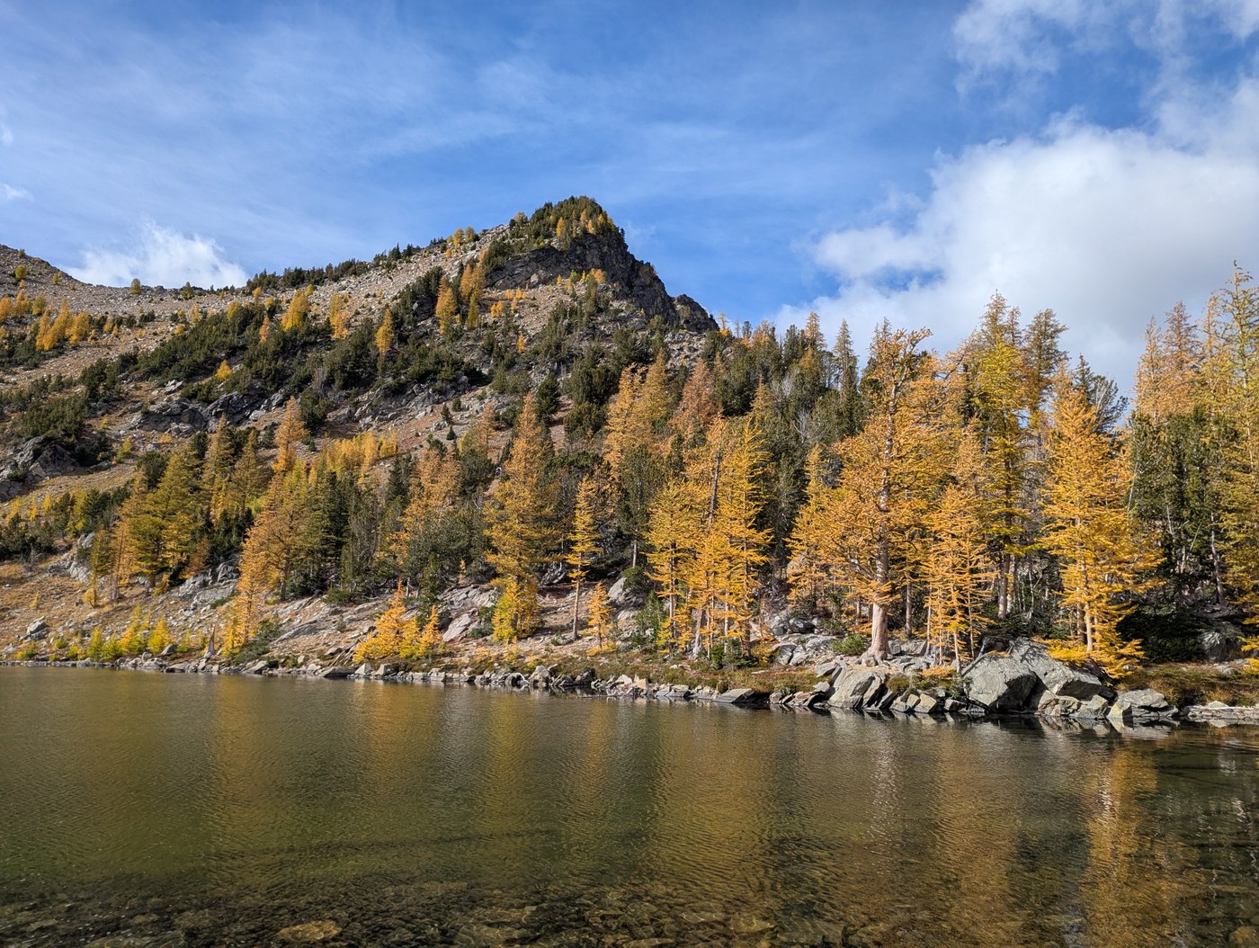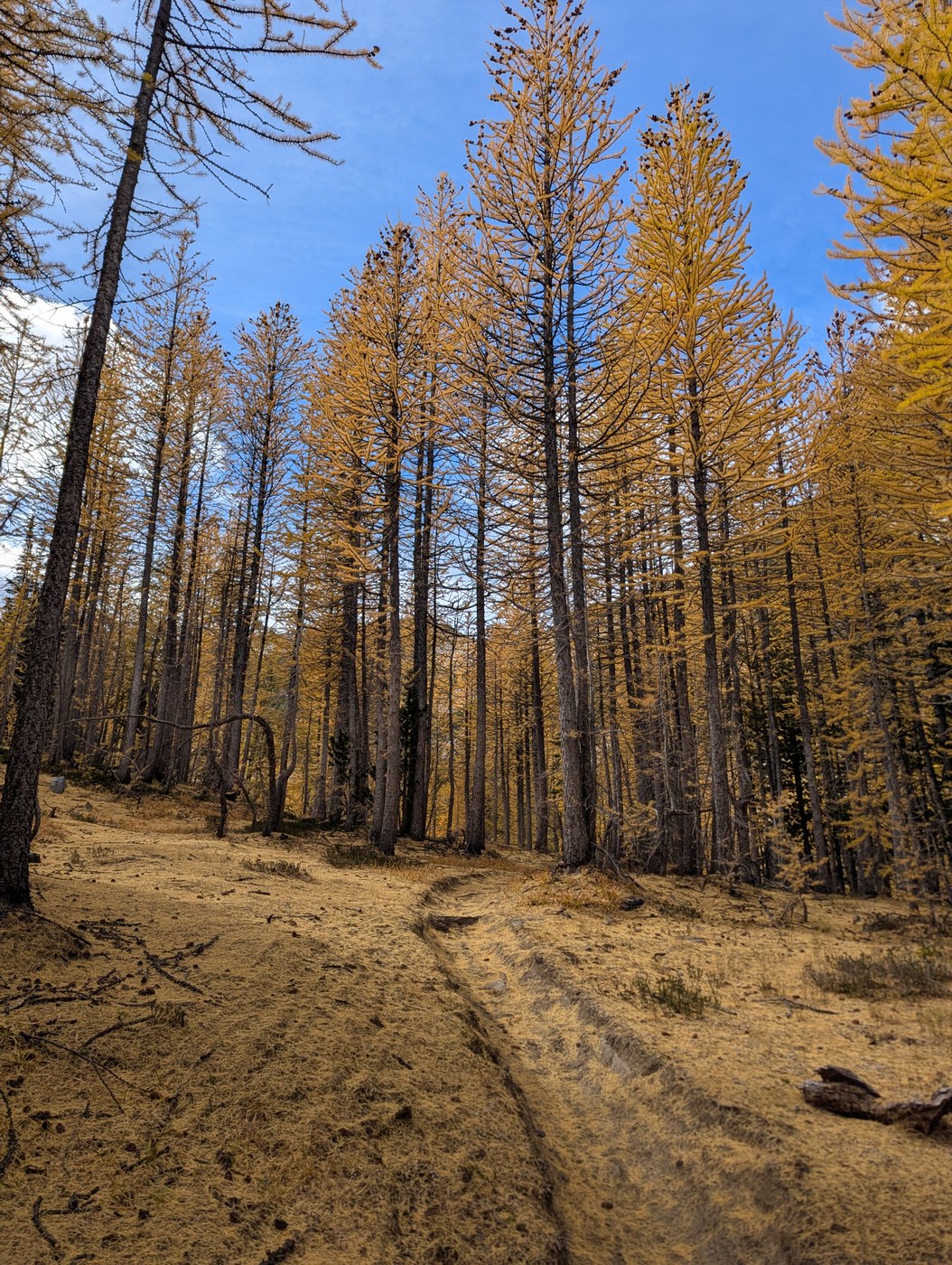 Larches are at their peak at Sunrise Lake and the needles are already starting to fall, so get them while they are golden. We did a quick overnighter and were rewarded with beautiful views and a little overnight snow 🥶. Two other parties camped at the lake on a Saturday night.