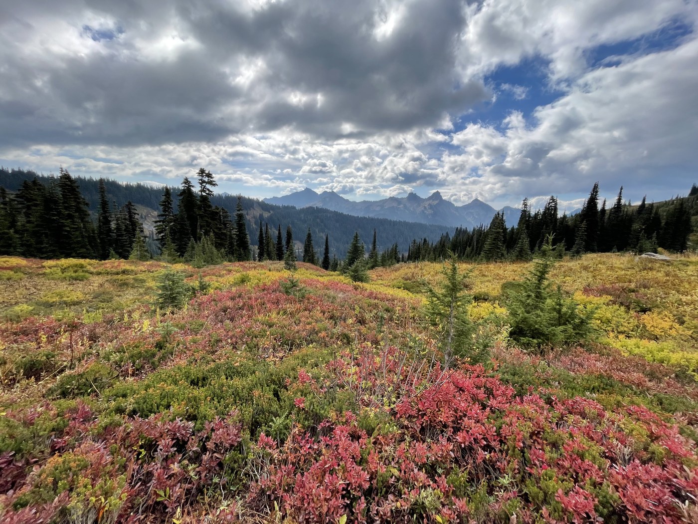 The best showing for fiery red was between the main lot and all along lower Skyline. Mazama had beautiful colors early on the trail as you look at the huge views. Lakes Loop and High Lakes Loops were quiet until you got closer to Mazama.