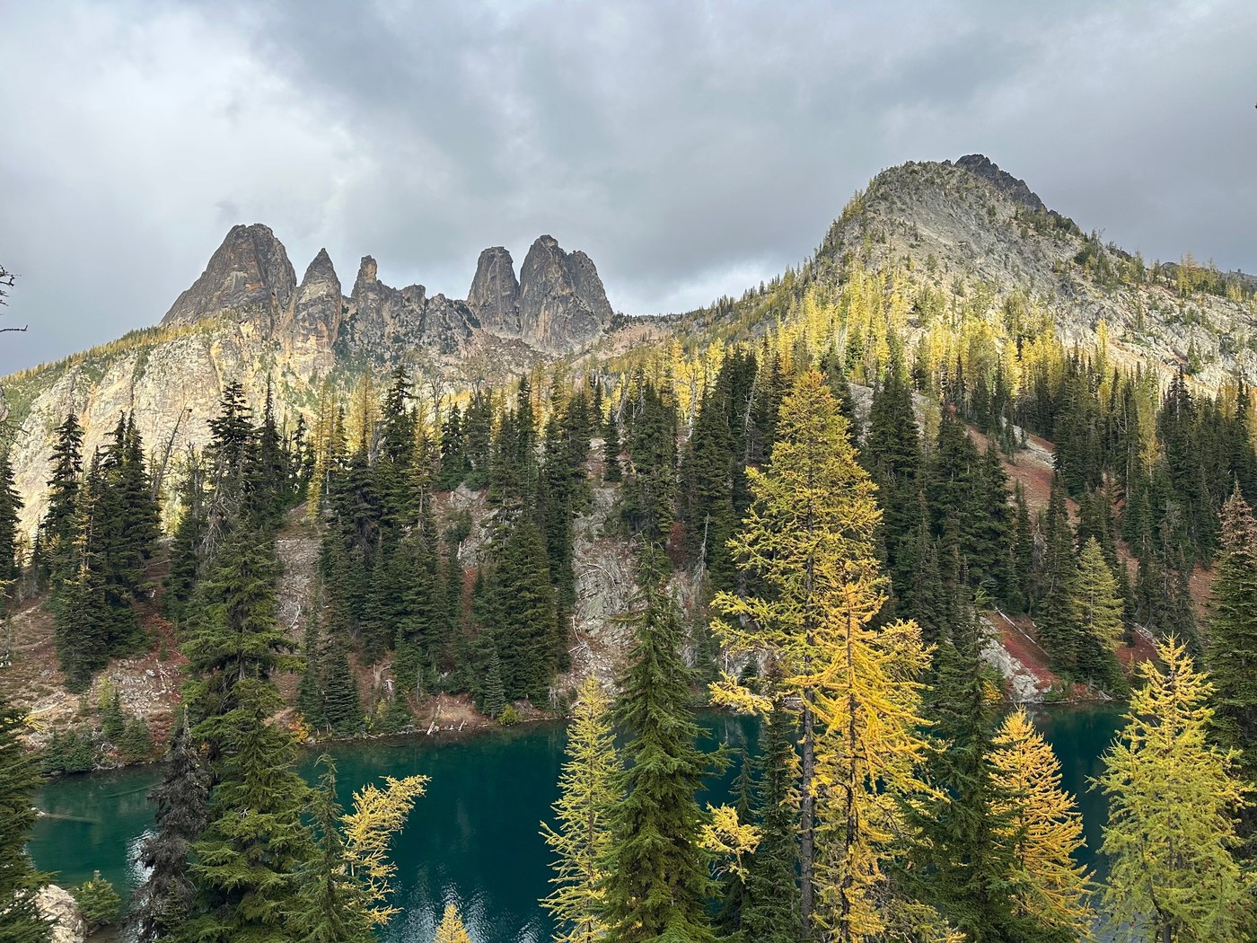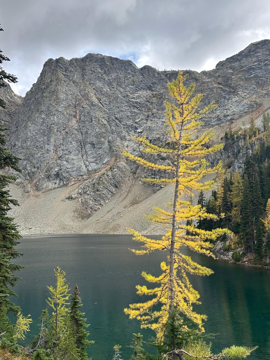 Larch madness! Great hike! Pretty crowded but that's expected. Expect to park along the freeway unless you are crazy early or hiking second or third "shift." Larches are really popping. Some in advanced color stages, some just starting. I really like this hike because you groove right through groves and groves of larches. The larches aren't super far away like in some other larch hikes. You could literally touch them (please don't tho). The lake is really impressive with a massive rock cirque peppered with yellowing larches. There is a little "Tarn Loop" that you can explore. I highly recommend doing this. Great new views of the area and some solitude. We saw a lone mallard diving in the tarn. Saw no other people on this loop. There is also a the ruin of an old log cabin up here. I wonder what this cabin was originally for or when it was built?