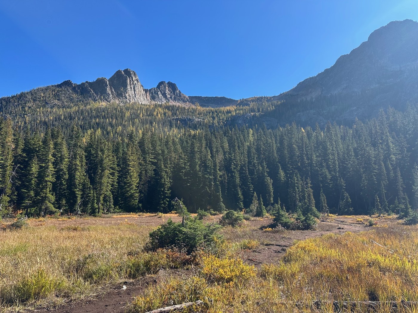 Trail is very smooth. Be prepared to share the trail with lost of mountain bikers and (less) horseback riders. Open views of Hinkhouse Peak and Molar Tooth right off the bat. Forest is open for most of this hike, a classic eastern cascades feel. The sheer size of this valley and the cirques under the peaks is impressive. More than I anticipated. Soon you can see Cutthroat Peak before dipping into denser forests. You come to a split in the trail after emerging from the thicker forest. The left leads to the lake, the right to Cutthroat Pass. However the right also completes a loop with the left branch. We took the left and it leads to a really nice flat wander through a very "fairyland" feeling mixed larch/pine/fir forest. Really beautiful with some meadows and bogs. Soon you reach the lake and wow, it is gorgeous. Take it from someone who has seen a lot of lakes with cirques, this one is one of the most impressive I've ever seen. So grand! The width of it, ringed >270 deg by peaks, and the height - 3000' from lake to the top of Cutthroat peak (as tall as El Capitan). Then add in the golden larches everywhere - you have a winner. I will definitely return again. We explored a bit and found where the trail loops (love a loop over an out and back) and looped back, passing the turn off to the pass, before reconnecting to the split. The loop was definitely worth it. More popular as we hiked out, but nothing comparable to the slammed trailheads of Blue and Maple Pass we drove by on the way back home.