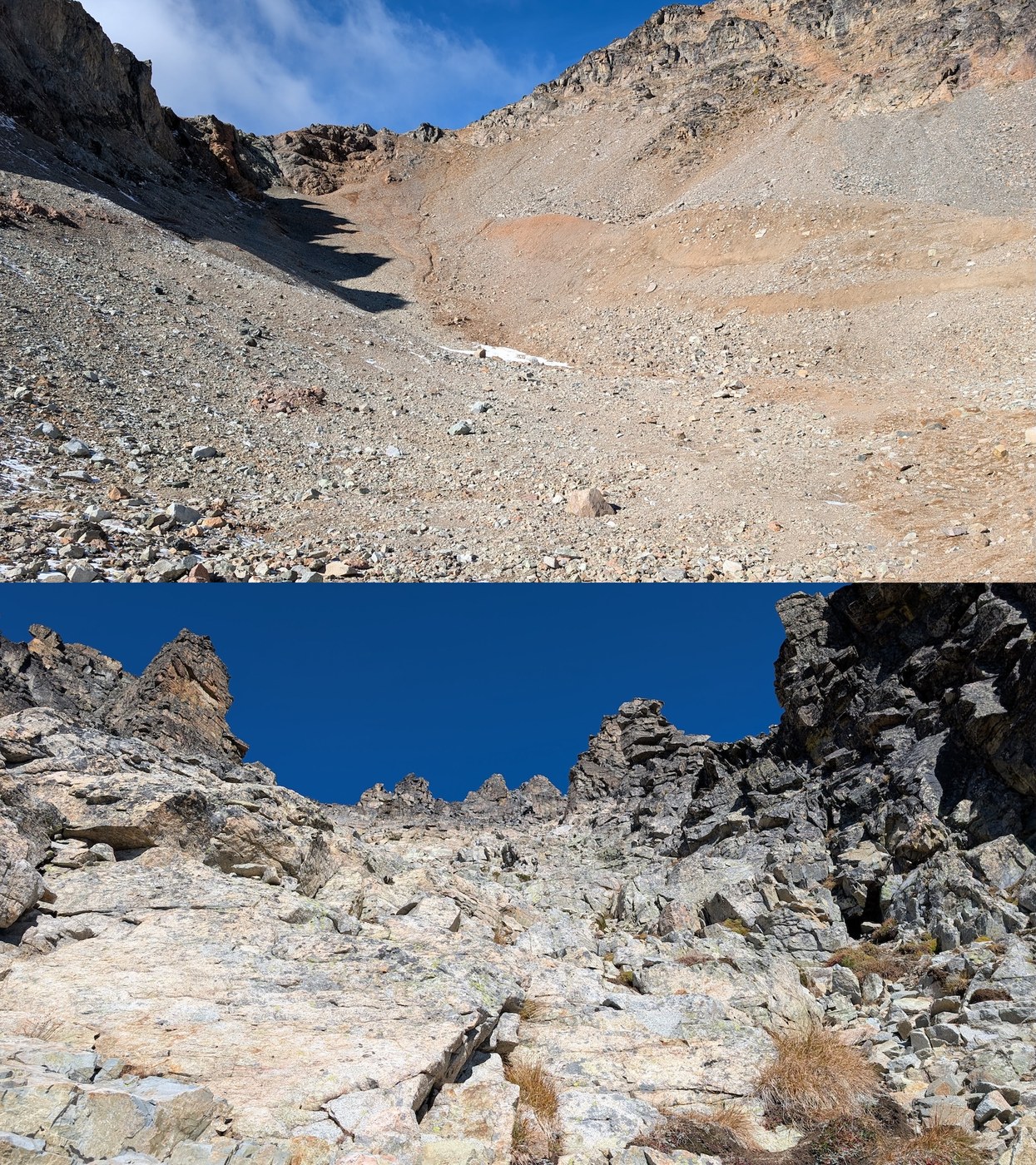 Once ascend the saddle, the scramble up a gully begins shortly. Cairns are present, but sometimes difficult to spot. Any semblance of a trail is difficult to follow. I kept having to take out my phone to make sure I was roughly along the GPS path, which slowed me down considerably. I got off trail a couple of times and had to double back before trying to “keep going” and getting myself in a worse predicament.