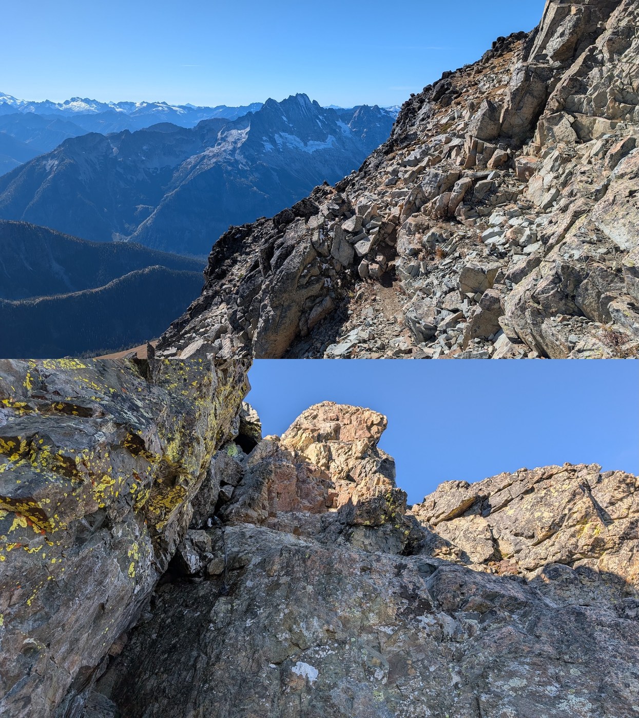 There is a bit of a false summit about 10-20 minutes from the real summit, which you can view a straight column ahead of you from this point. Honestly, most of the views are pretty good here and like the actual summit, so no shame in turning back here if you find the scramble up to the true summit more than you are comfortable with. There’s a lot of debate on if the scrambling here is Class 3 or 4. I’d say mostly Class 3 with a very short Class 4 move. The exposure I felt wasn’t as bad as some previous reports made it sound like, but you would definitely get hurt if you fell. By “exposure not as bad” I mean it wasn’t completely as “airy” as I thought, so I’m wondering if I took a different route somehow. Regardless, it is definitely a bit of climb you have to be comfortable with. You can see the pics below where someone’s put a short rope to ascend a particularly slick and smooth part of the rock right before the summit. The handholds for the short climb are decent and reassuring. (EDIT: looking back at earlier reports, like this one -- https://www.wta.org/go-hiking/trip-reports/trip_report-2024-10-15.131136429028 -- it mentions you can avoid going up the rope/rappel section I have a pic for below, and that solid Class 4 moves are available on a better ascent if you keep traversing right. I completely missed this and had gone straight up the rope route.)