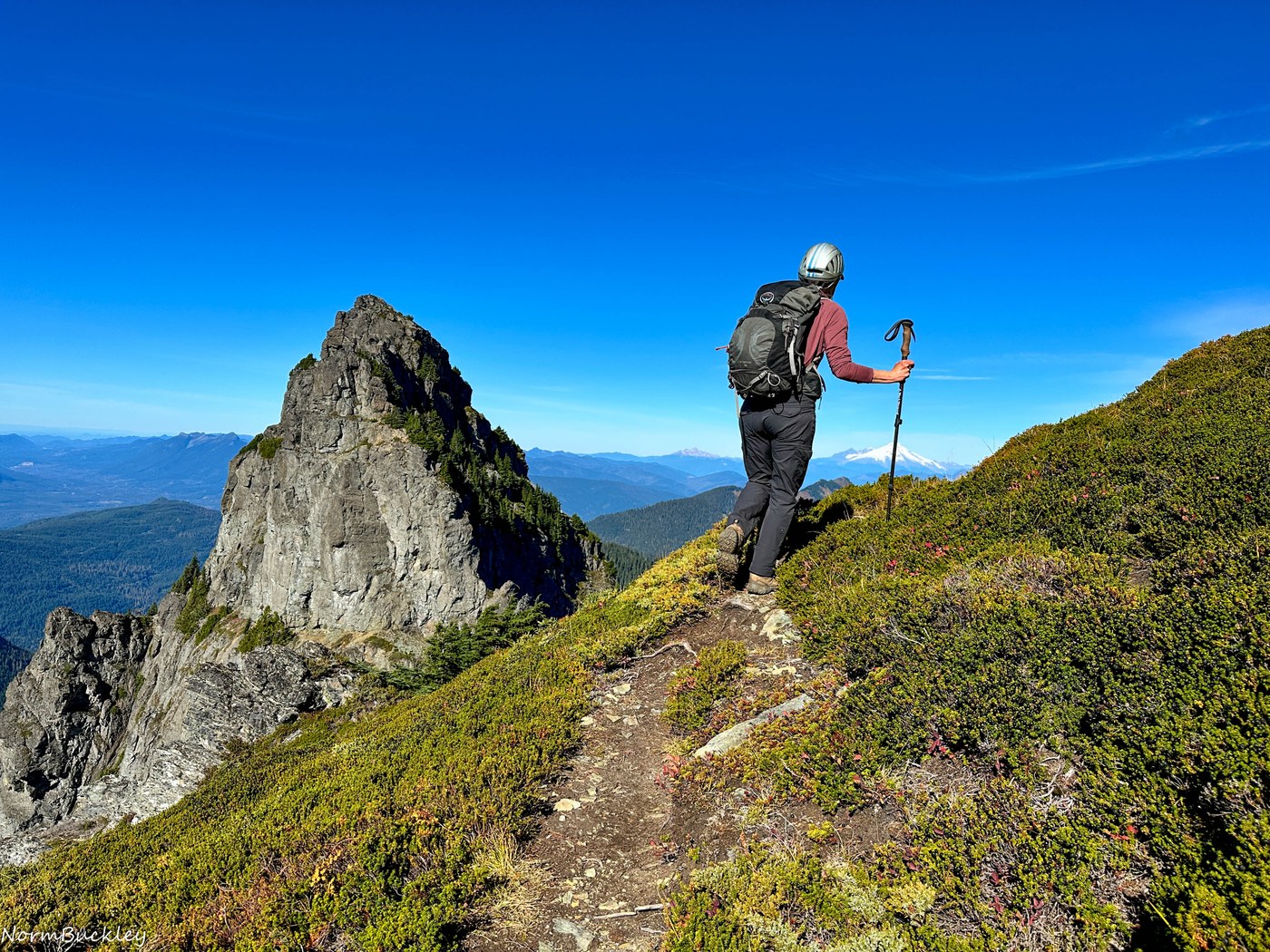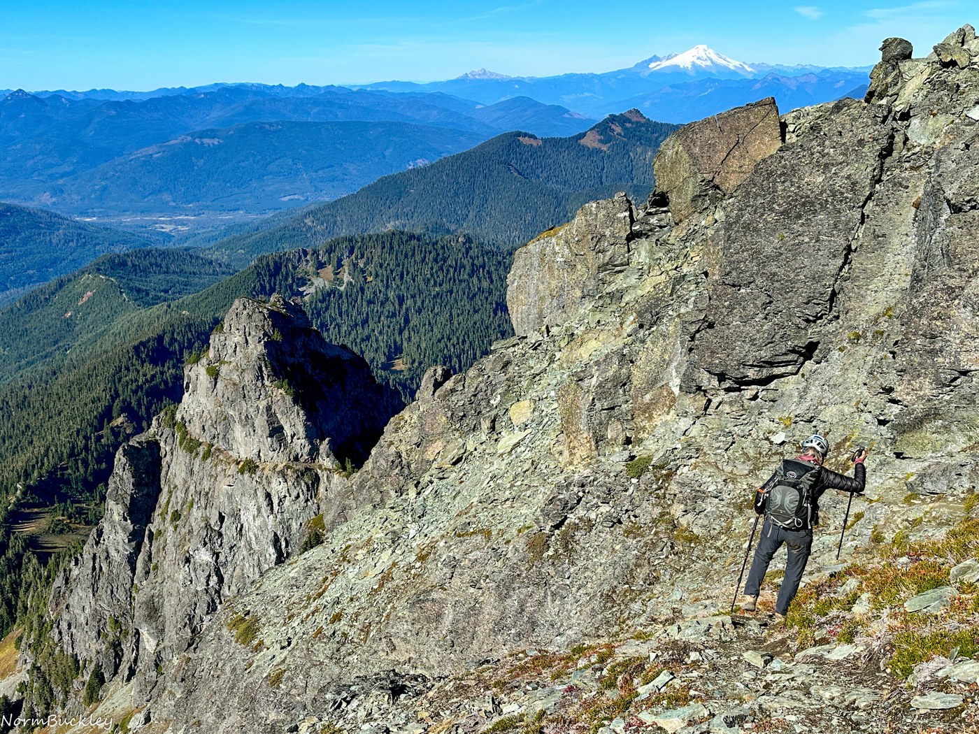 We left the trailhead (4,900') around 9:30 AM, hiking a pleasant wooded trail that follows a ridge. There were about ten fallen, step-over trees along the way. A tall vertical rock horn makes for an interesting photo backdrop. The White Chuck Trail continues for 1.4 miles (per Gaia Topo map) to 5,700'. After that, a boot path climbs up a rock-filled gulley, crosses exposed rock, and then ascends another gulley to reach the ridge. Some moist dirt patches made the ascent slippery in places. The boot path continues below on the south side, then there's a gap to cross before heading up to the summit. We reached the top three hours after departing the trailhead. Near the summit, we encountered an icy patch that was easy to navigate around. A rare brass Mountaineer-labeled canister sits under some rocks at the top—look for it and sign in.