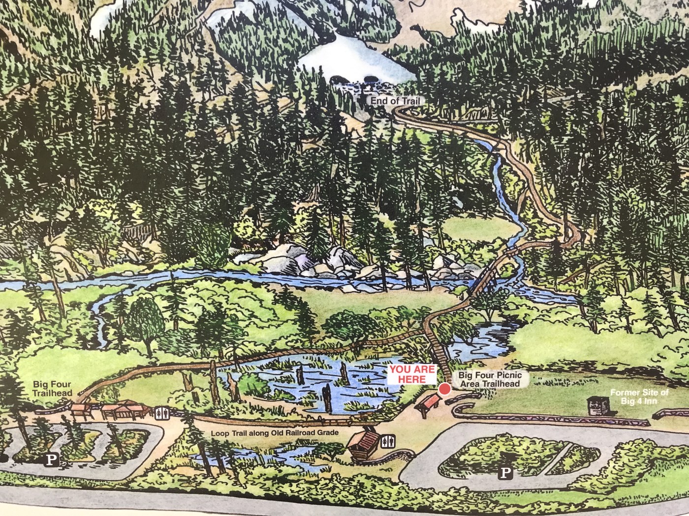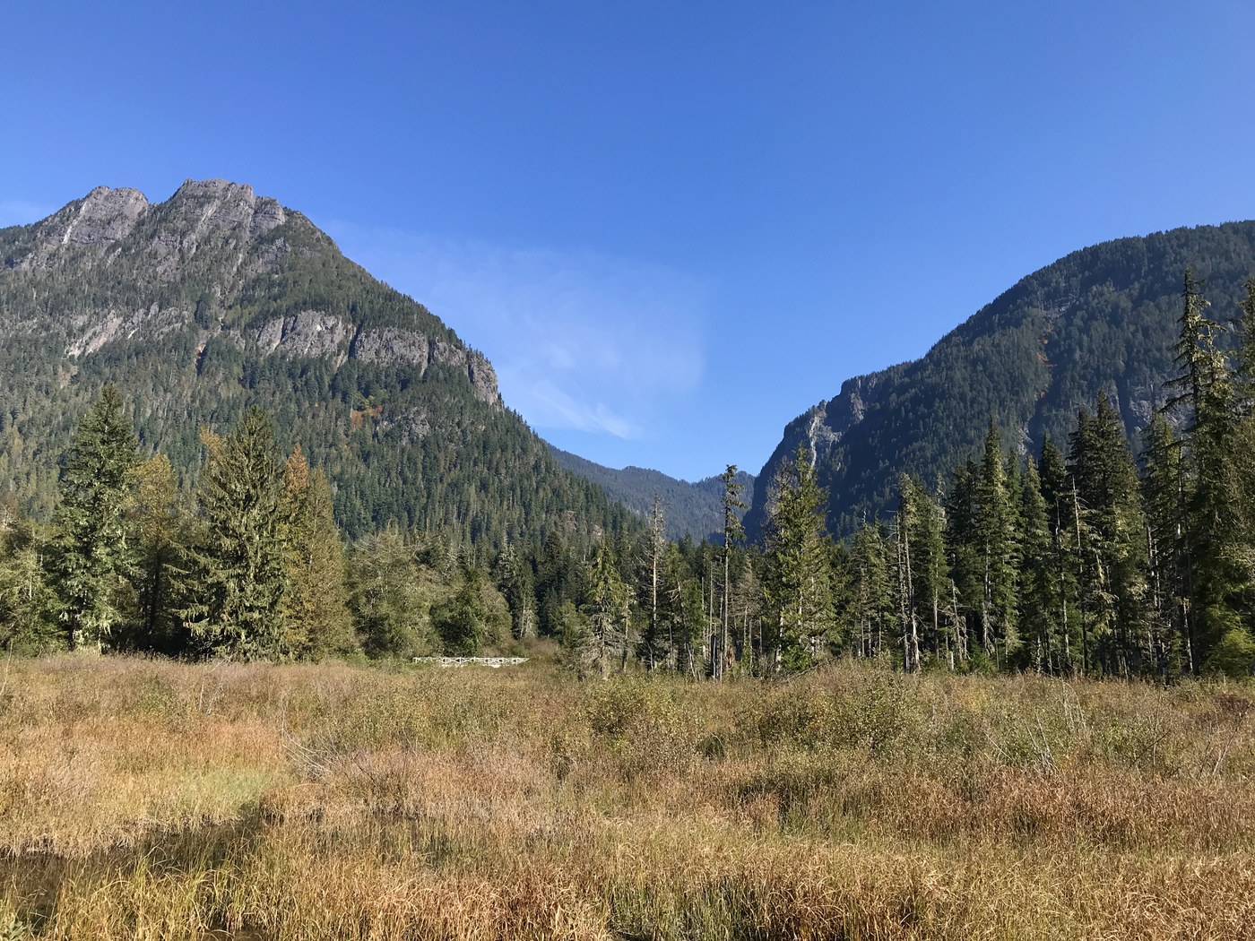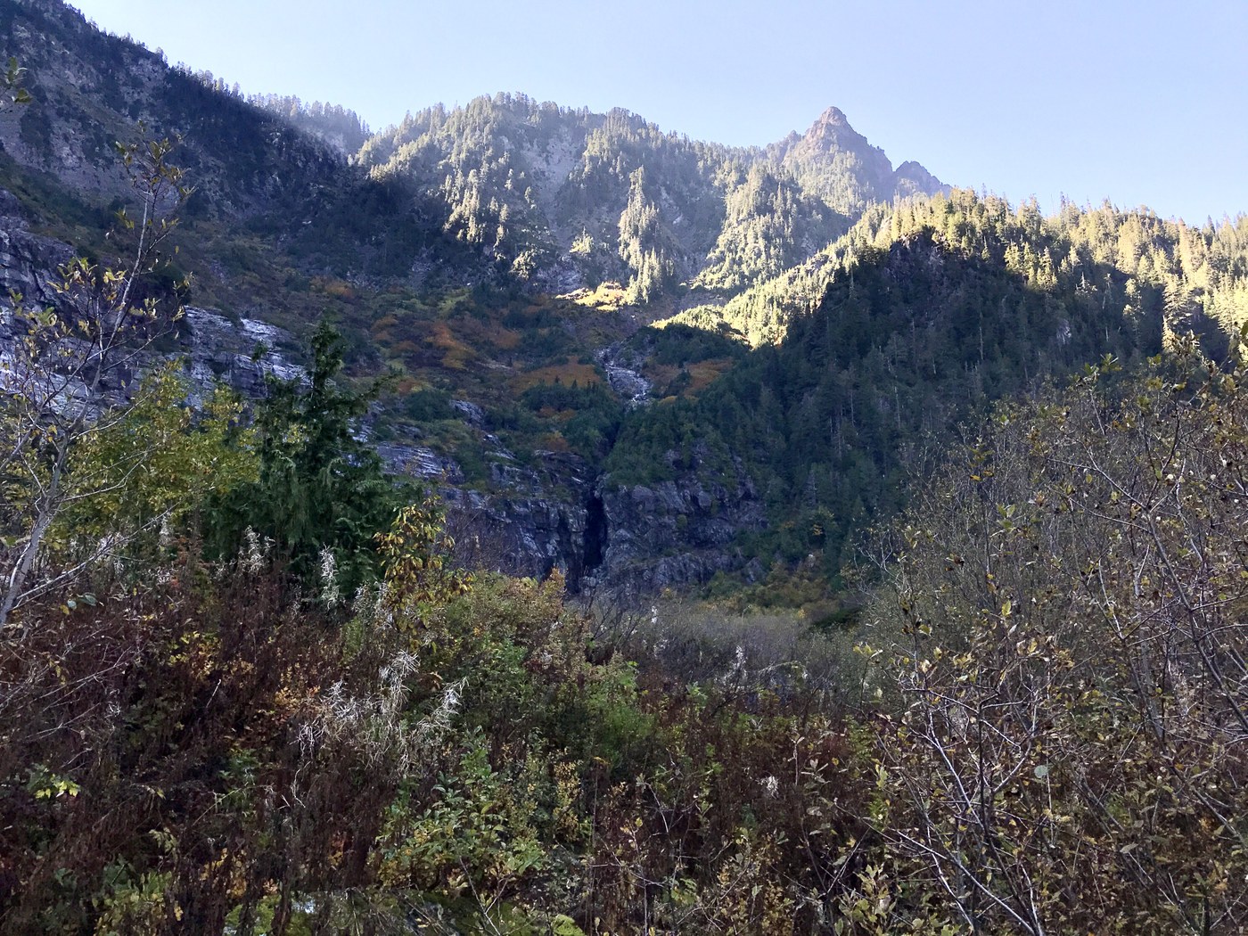 Lunch in the sun was hot on this last warm day of the year. There were minimal views of Big Four from our picnic table due to the haze and low angle of the sun. You have to hike in the cave basin for those. I was amazed just how hot it was as we hiked the board walk across the marsh, and then how much it cooled off as we crossed the river and ascended in the shade of the forest. The ice caves are always stunning even this late in the season, but we were there to admire the falls colors against the face of Big Four. It really is a fabulous place, very much worthy of being in a national park. Being good citizens we stuck to the formal trail and ended our viewing at the little platform on the ridge. Most other people approached the caves although I don't think anyone entered as large blocks of ice have fallen and obscured the mouth. When you look at pictures you can see how there are "crevasses" in the ice and how if/when that ice comes down it will fall right on the people admiring the caves up close!