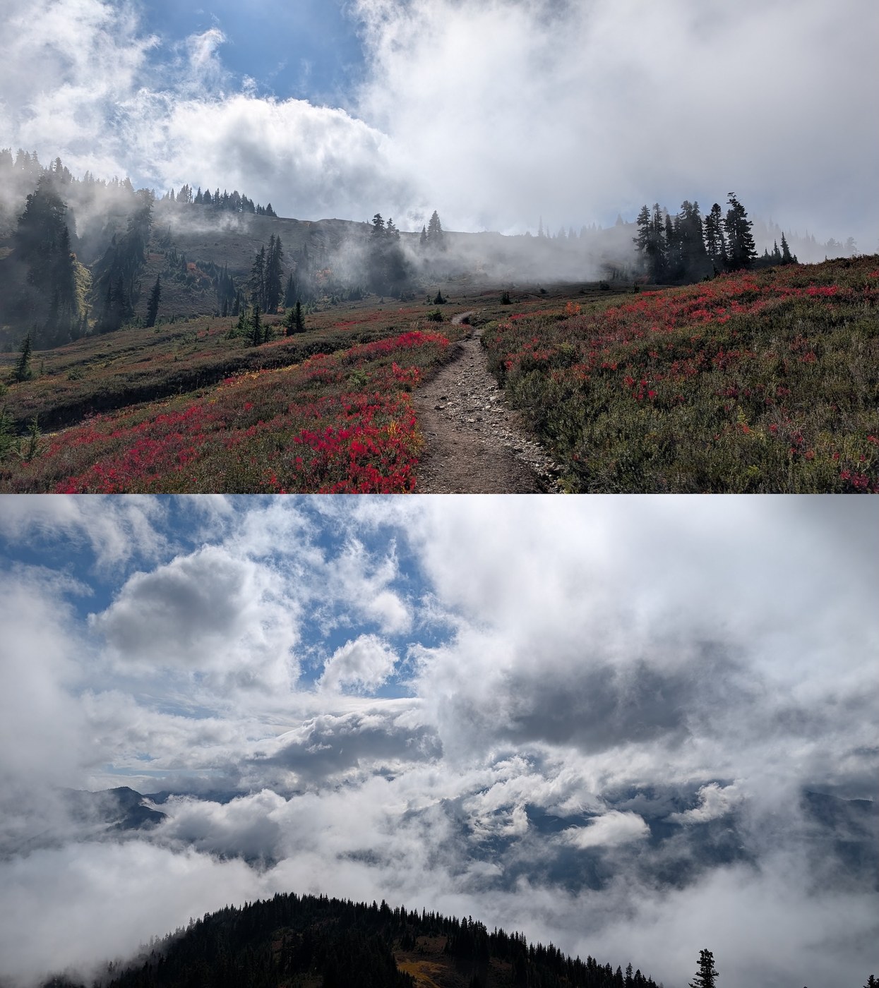 Did this on an injured knee originating from Lewis/Wing Lake + Black Peak two days ago, but wanted to get in something short while had another chance for decent weather. Weather forecast called for “AM clouds, PM sun”, and lucked into the clouds parting right when I got to the pass. Great fall color backed by some moody clouds. Unfortunately, didn’t get a chance to explore more aside from just going up to Excelsior Peak, as the WTA report and others suggest doing some mini loops here along with the High Divide. Blueberry bushes are around in decent amounts and can be sniped straight from the trail.