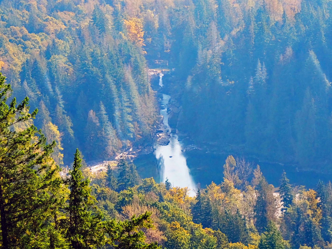 It was a very hazy day and you could smell the smoke. From the top looking down up the Skykomish Valley the mountains appeared as silhouettes, the ones nearest were darker and had more form and the receding ones lighter and no detail. But it is always a great hike through the forest and rock formations.