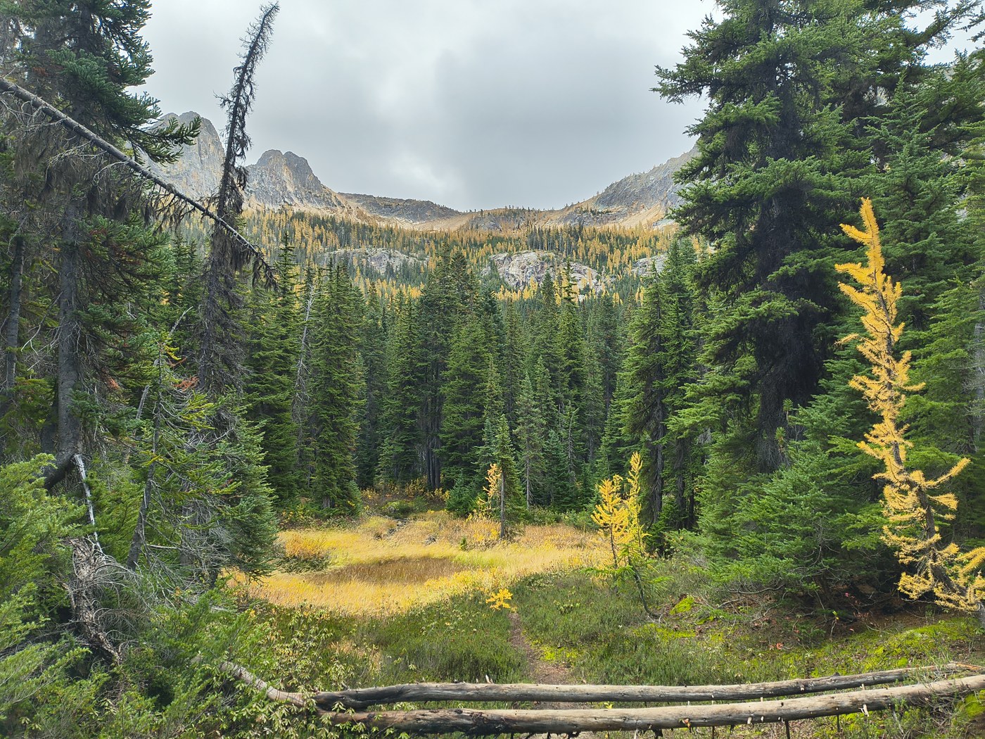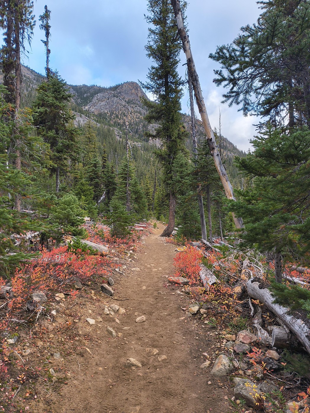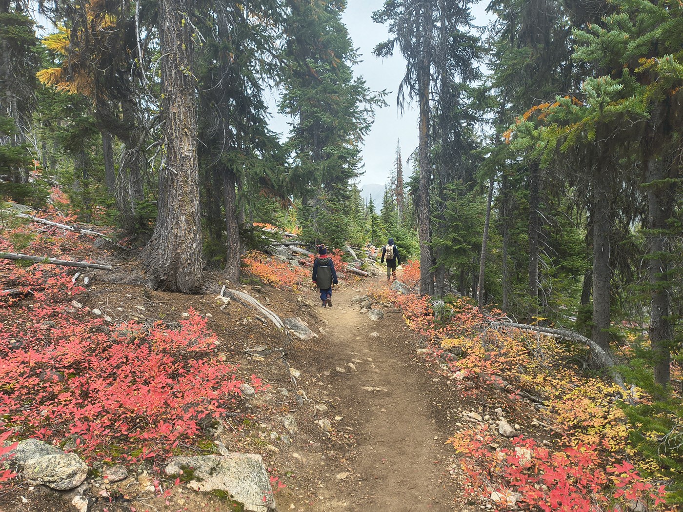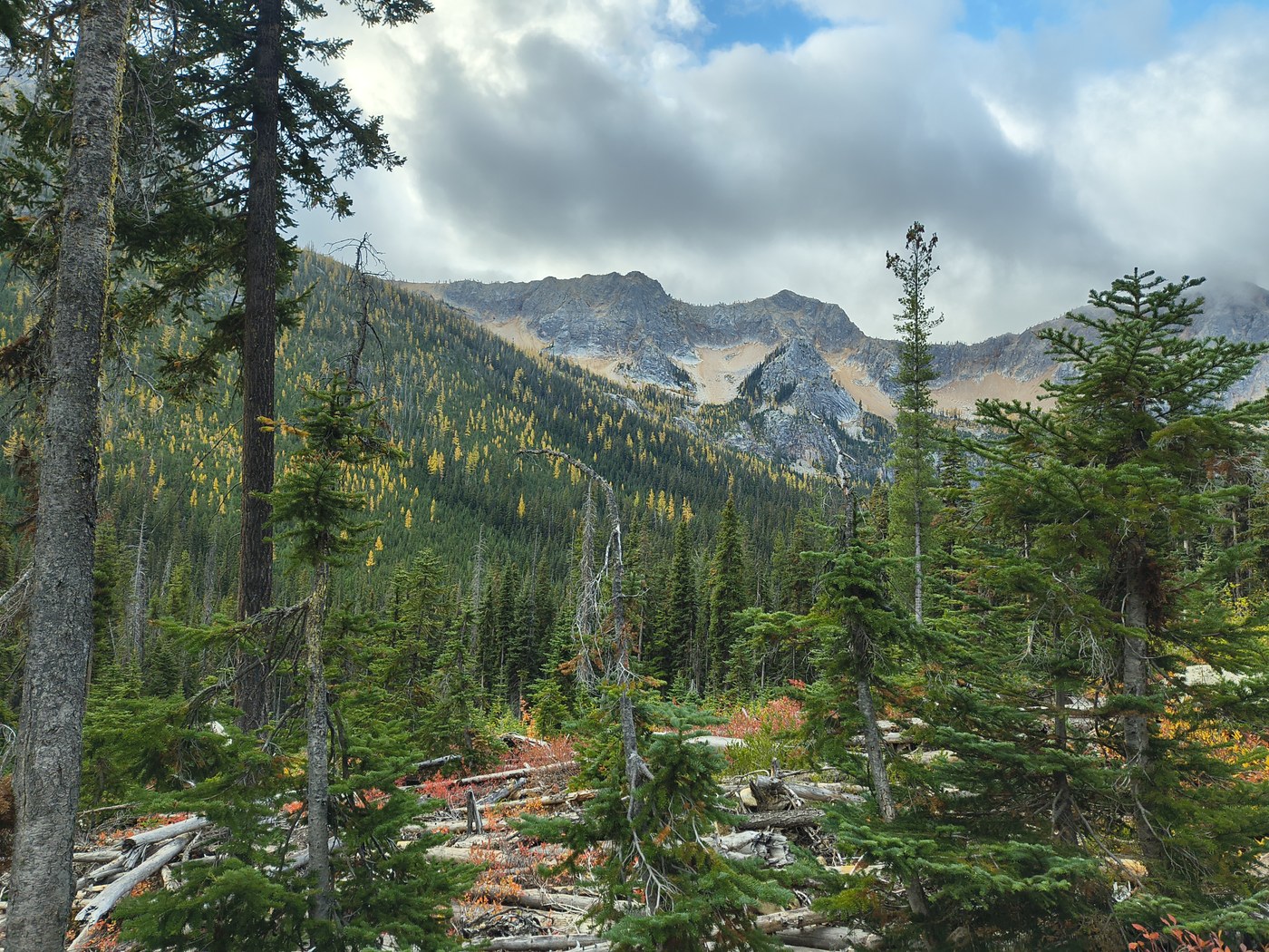 Hiked on Saturday, perfect weather conditions. Drove past the trailhead Sunday at 12pm and it was snowing, about 2 inches on the ground on Highway 20. We arrived at 8am and there was parking in the lots on Sat. We came back at about 11:30am on Sat and there were cars down the road for about half a mile. Fairly busy trail on the way back down, starting around 10am there were lots of dogs and bikers. Not my favorite to have to yield to bikers. Heard a kingfisher at the lake! The larches and fall foliage all around were beautiful.