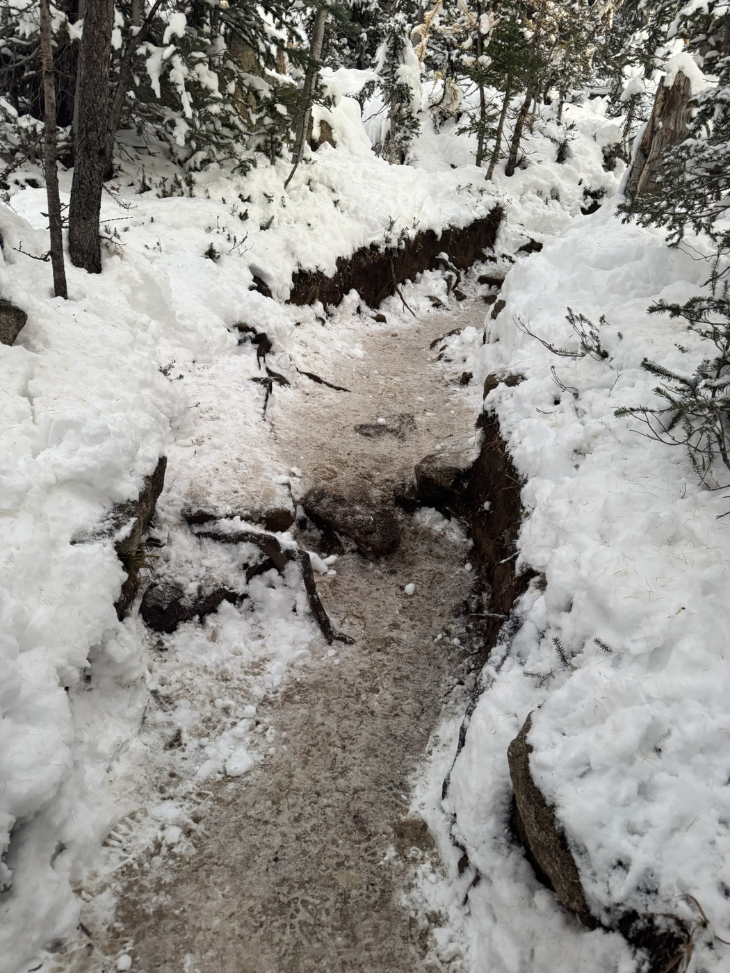 The trail is snow-covered the entire way. I wore microspikes and had no issues with slipping. People who were wearing hiking shoes seemed to be doing okay too. It was the people wearing shoes with no traction (like Converse) that seemed to be struggling. A few groups without good footwear turned around. I’d guess that the trail will melt a little during the day and refreeze overnight so I’d guess it will become slipperier over the next few days. It was about 29 degrees at the trailhead as I was leaving a bit after sunset.