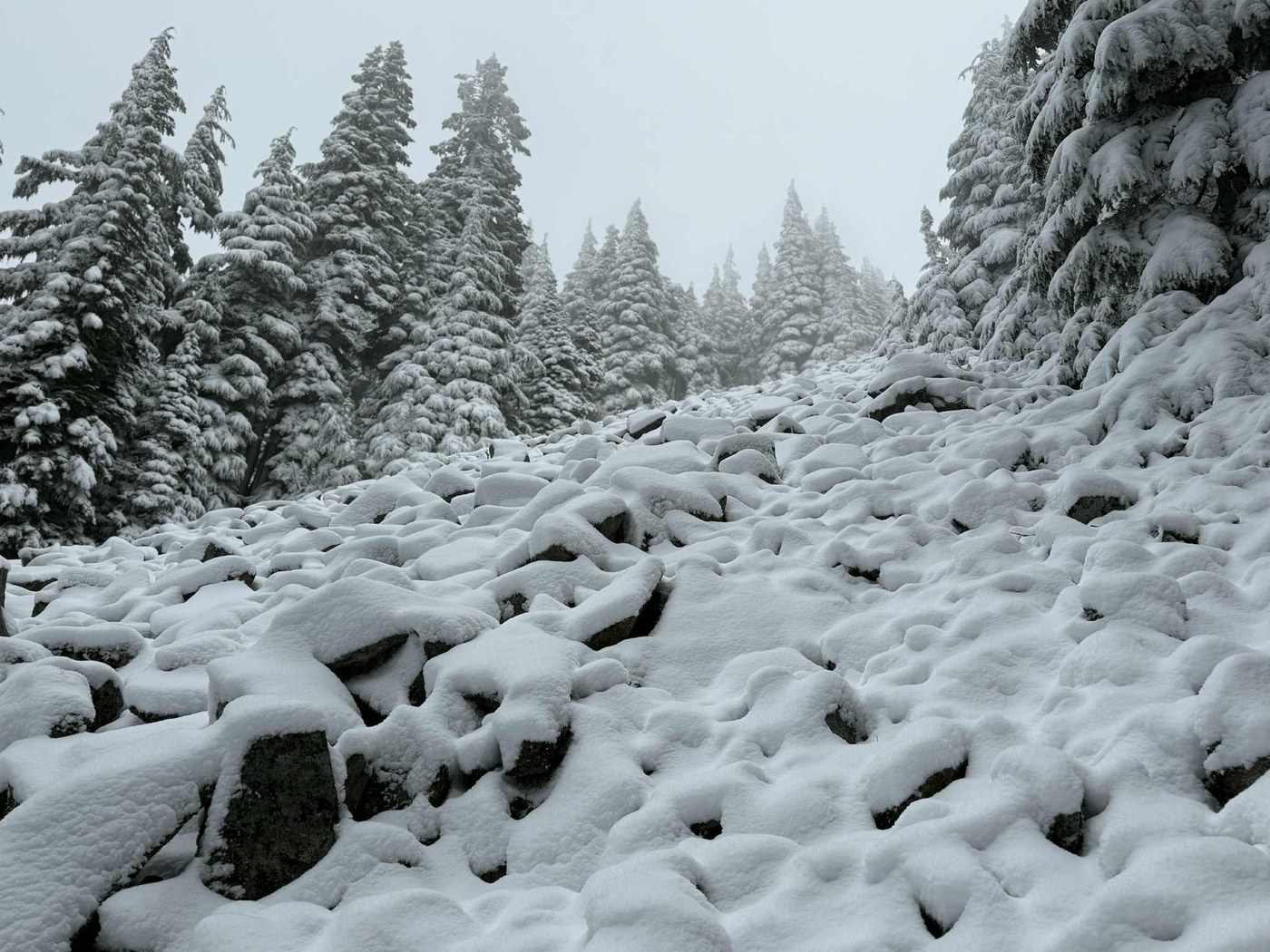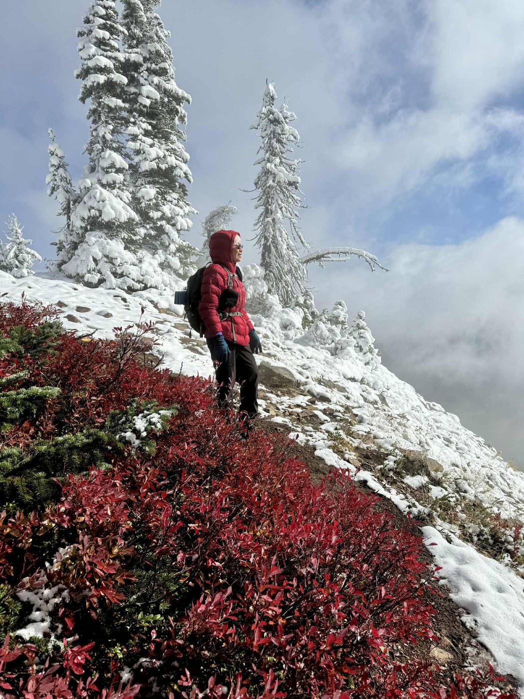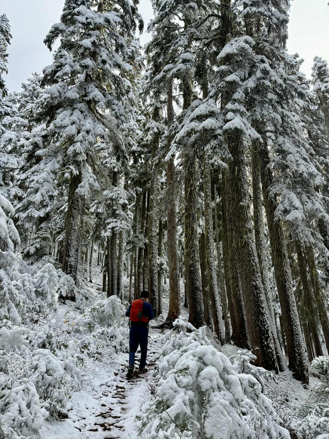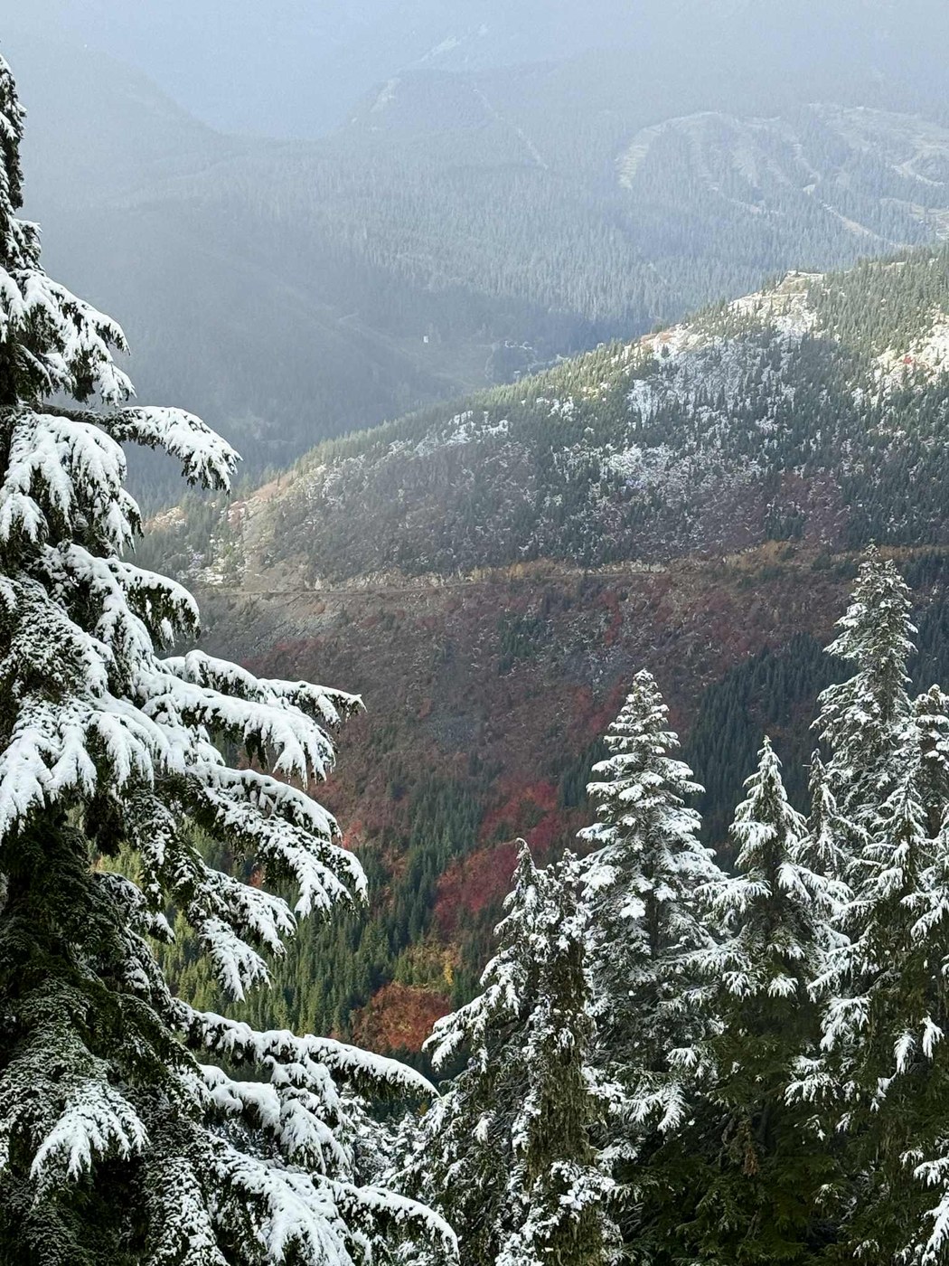 The trail was covered in 2–5 inches of snow during the last 1.5 miles to the summit. We followed a good boot path until it intersected with the trail toward Mount Margaret, then broke our own trail to the summit. There were no views when we reached the top—it was windy and cold. We quickly snapped a few photos and heading down. A beautiful winter wonderland hike in the Autumn.