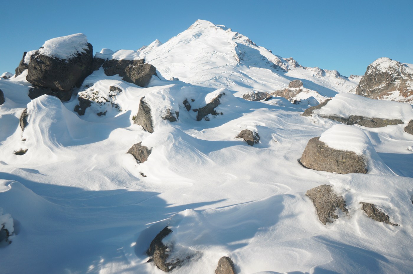 Surprising to me, the full length of the road to the Artist Point parking lot remained open after the Sunday storm and there was some sanding on the last stretch. This is the first time in over ten years living in Bellingham that I have seen them treat that stretch of the road rather than just closing it. I left the Artist Point parking lot at 4:20am for a starlight and last quarter moon hike and to see a sunrise at the East Portal. Since I left about a half an hour later than I should have, I had to make up about a half an hour from my usual pace to get to the portal in time and didn’t really get any star gazing in. In the dark, basically any part of the trail that wasn’t snow covered was glazed with ice. Very little snow is on the route before the Chain Lake Loop junction. Descending down into Ptarmigan Ridge Trail from there are some very thick icy stretches. The snow depth out to the Camp Kiser area only exceeded a couple of inches in short drifted stretches. By the time I reached the base of the East Portal, snow depth was up to 5 or 6 inches and on top of the portal, 8 to 12 inches was the norm. The clear air and views today were breathtaking and I stayed on the portal for two hours. Didn’t encounter anyone else until arriving back at the Goat Lake viewpoint (didn’t look at all frozen, yet). From there, there were about a dozen others on Ptarmigan Ridge, though many more were encountered after returning past the lake loop junction. A lot of the icing on the lower trail after the junction melted out in the sunlight, but became a bit muddy. These conditions will probably only hold for another day or two as more stormy weather is forecast for Thursday night.