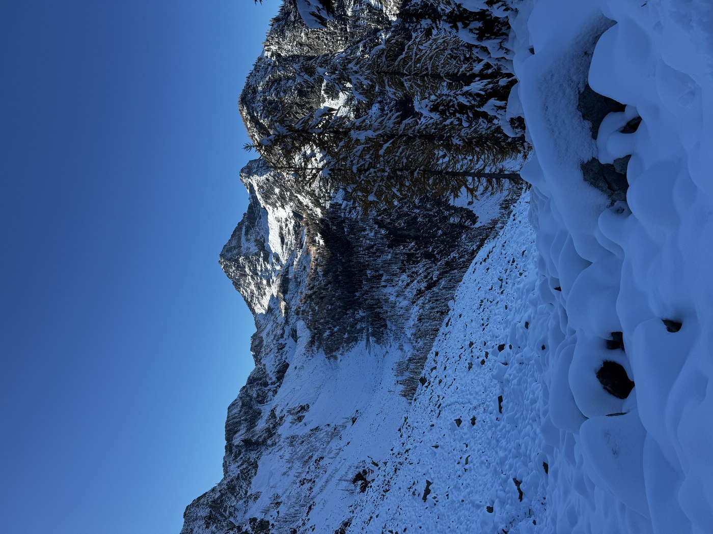 The talus field you cross to get to Lewis Lake is challenging/sketchy now. Whoever broke trail on Monday did not always follow the actual trail (honestly, it would have been near impossible to follow the rock cairns under all the snow), so there are lots of awkward snow covered boulders. If you haven’t done this hike before, this is no joke! It’s about 0.6 miles of talus/boulder field, on a steep slope, covered in snow.