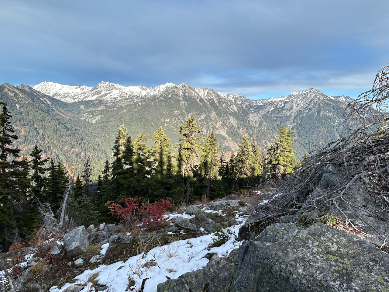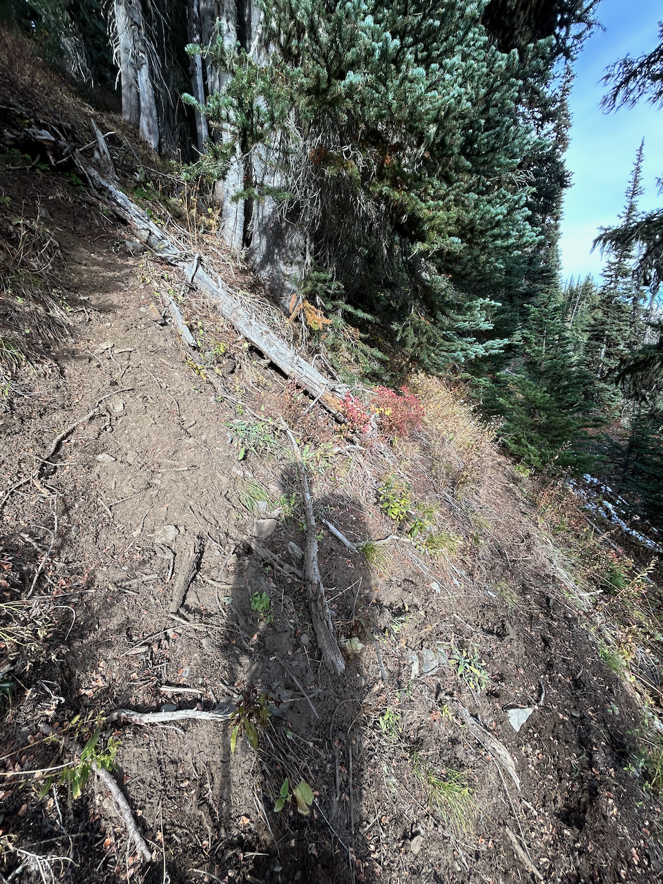 The ridge trail is a mix of less fun conditions: I had to hop over and go around lots of down trees, the huckleberry bushes were thick in areas, and the trail higher up was extremely narrow and eroding. Not an impossible hike, but definitely more of an investment..