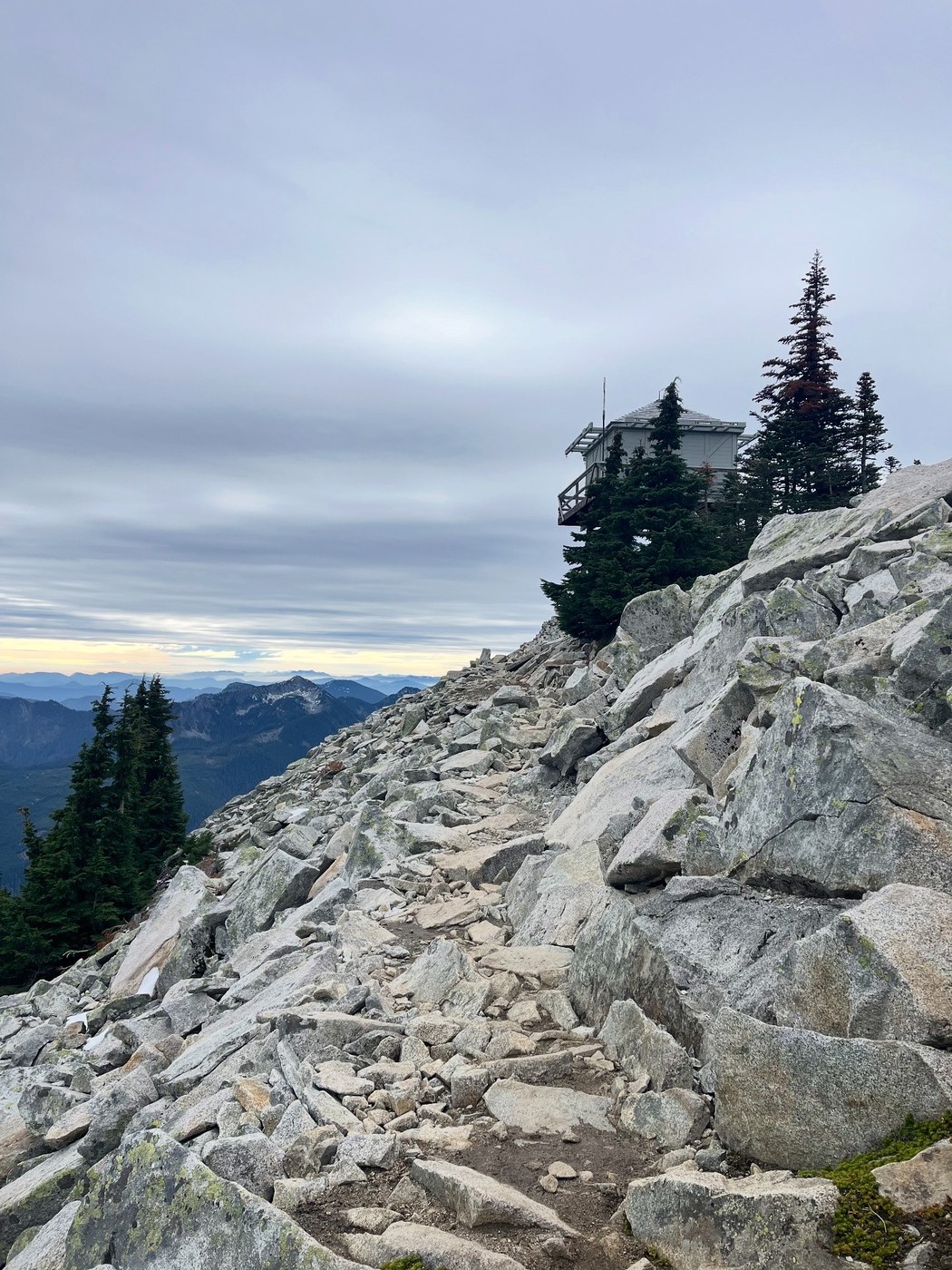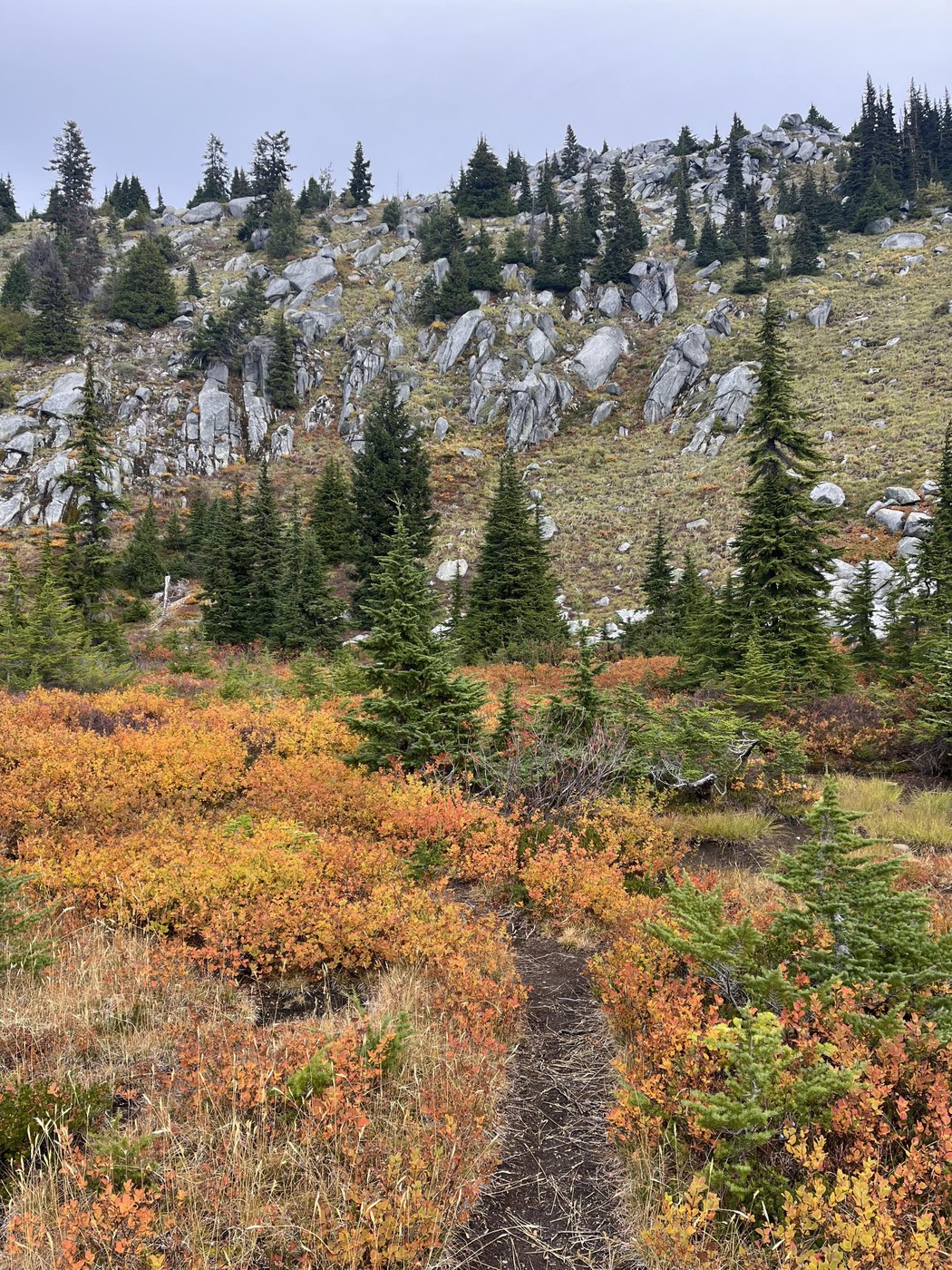 Arrived at 8 am and there were many open spaces in the parking lot. The trail is in great shape, with lots of fall foliage in the upper meadows and in the gullies. There are ripe berries in the upper meadows, though they are a bit past their prime. We took the winter trail which approaches the lookout from the east. The final climb had a bit of packed down snow and ice. We brought spikes but didn’t use them. One thing to note is that there are some social trails and many people seem to have cut the switchbacks. Be sure to stay on the obvious trail to avoid making new trail.