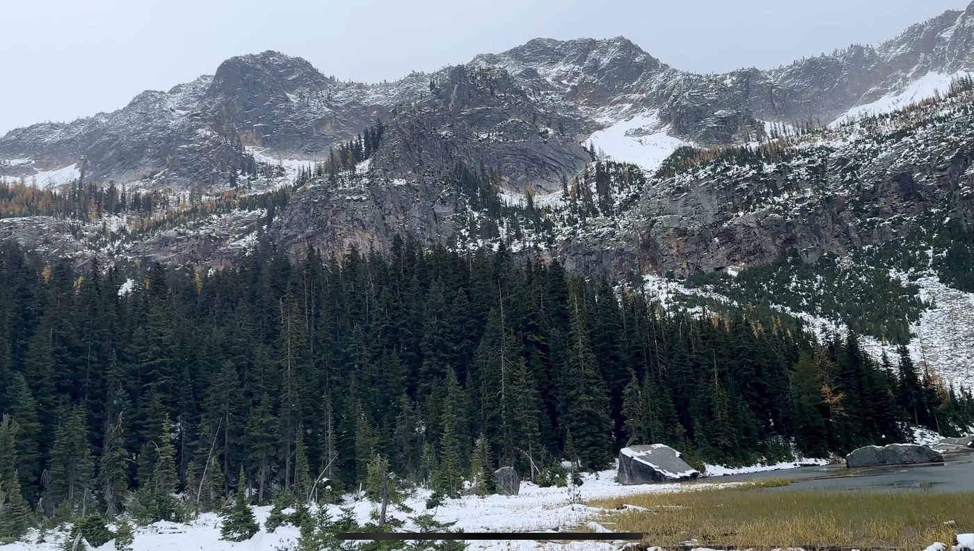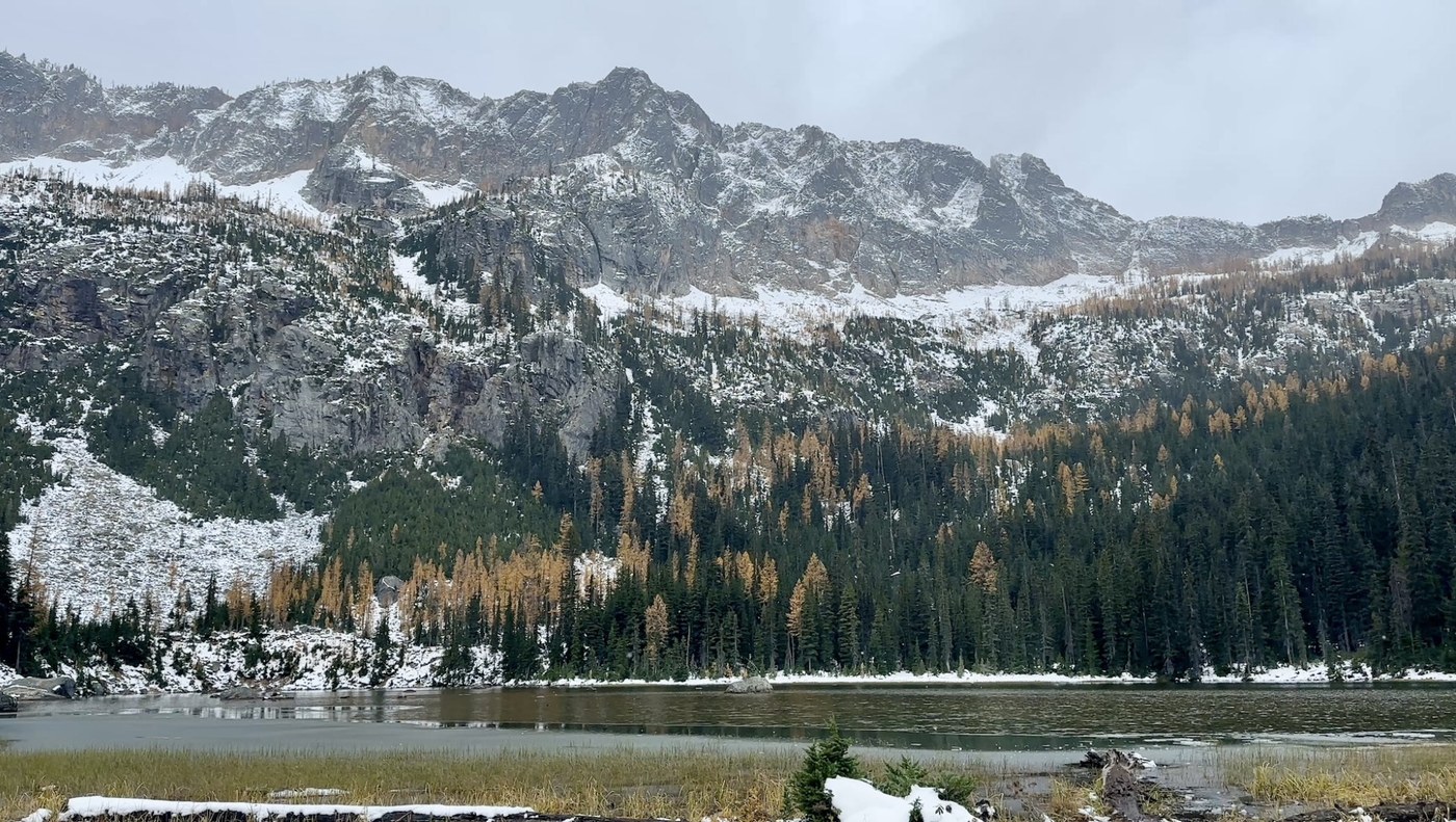 The panoramic view of snow covered mountains with larches and the lake was gorgeous.