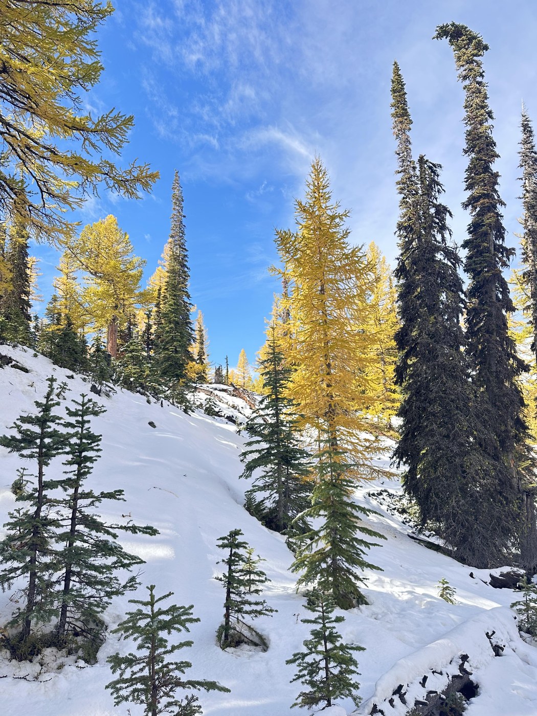 Beautiful afternoon at Clara and Marion. As of today no snow on road and intermittent on trail. Was slushy and muddy in places and full snow in others. Carried microspikes but didn’t use. Poles were helpful. Larches at peak. Both lakes had frozen layer.
