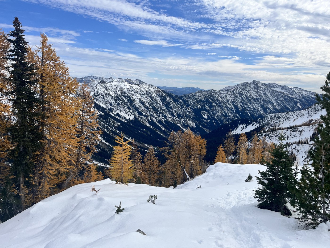 Beautiful morning to hike Carne mountain before the rain clouds rolled in. Freeze/thaw conditions on the trail and it was icy in the morning on the way up and muddy on the way down. Trail increasingly snow covered for the second half, with calf/knee deep snow between the basin and the summit. Trail was easy to follow until just past the basin then some route finding and trail breaking required through the snow. Hiked with microspikes and poles. Plenty of parking at the trailhead and it was a lovely quiet day on the trail- we only passed 6 other people. Larches past glacier basin a combination of prime and past prime, and they were stunning in the snow.
