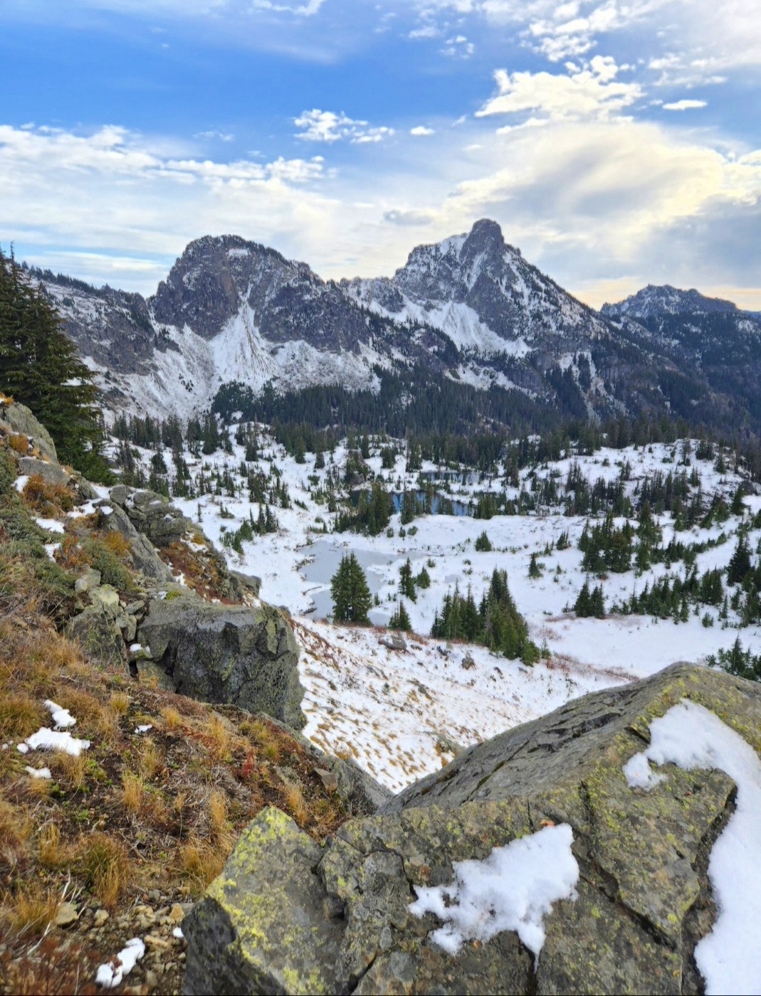 Lila Lake is starting to freeze over but is not entirely frozen yet. The Alta Mountain Tarns are all frozen over with a dusting of snow. The trail out to Lila was obviously completely snow covered. I was tired and once we got back down Alta I decided I didn't feel like going out there.