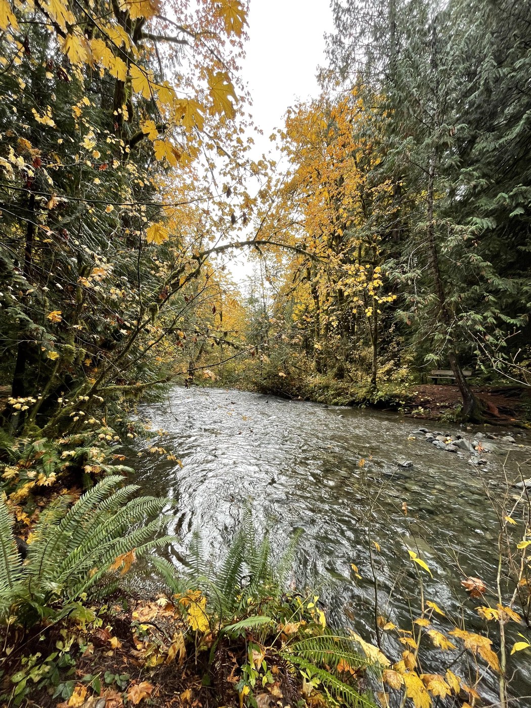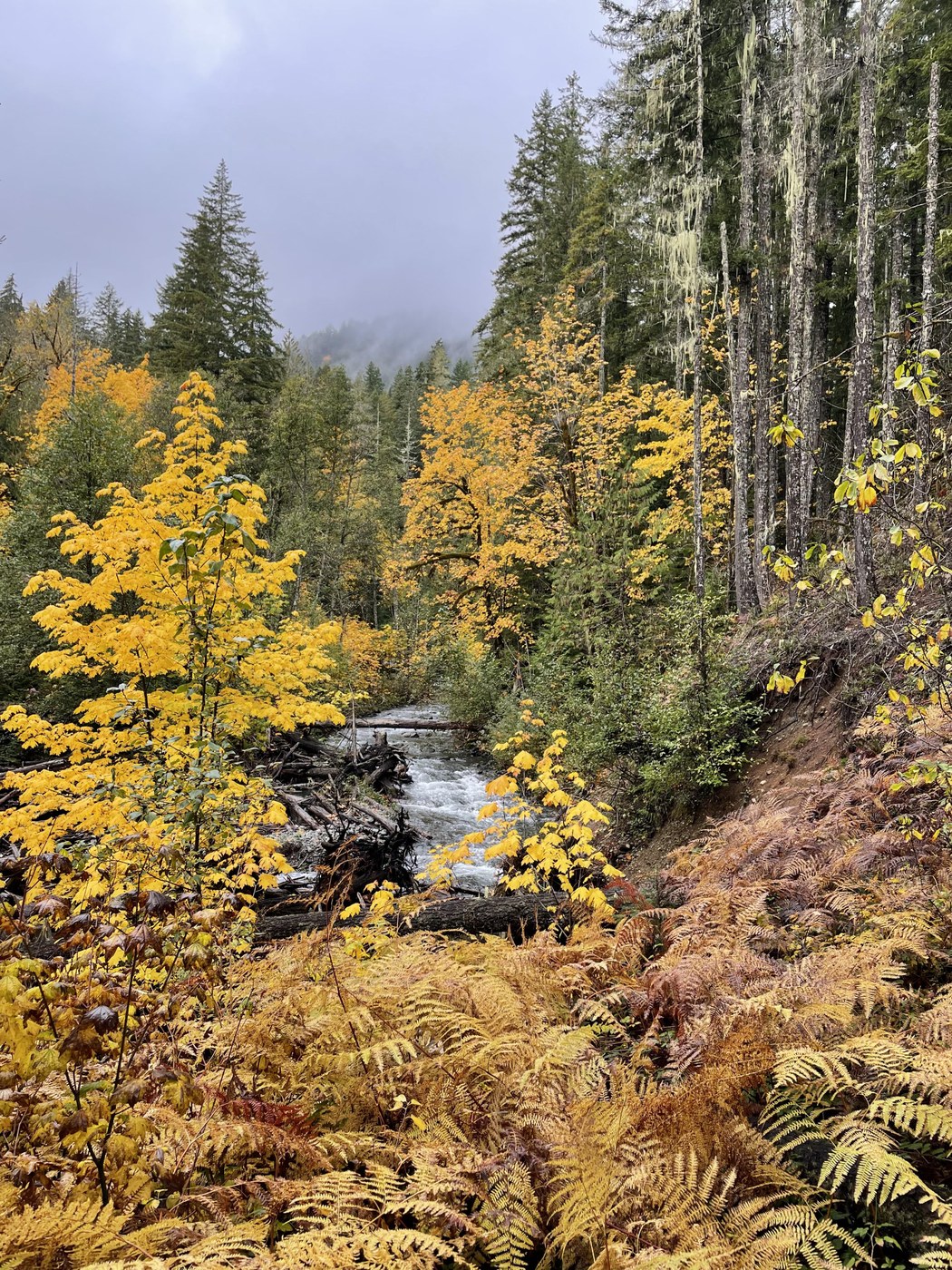 Upper Big Creek is in pre-winter mode with the gate to the campgrounds and the bathrooms locked. The trail is in excellent condition and one of the best to enjoy in rainy weather because water flows through the magic of brilliant trail engineering where it's meant to flow. There are a few downed trees, all easy to step over (one you can walk around and still stay on the trail). Two or three look fresh from this weekend's big wind (located on the water side half of the loop).