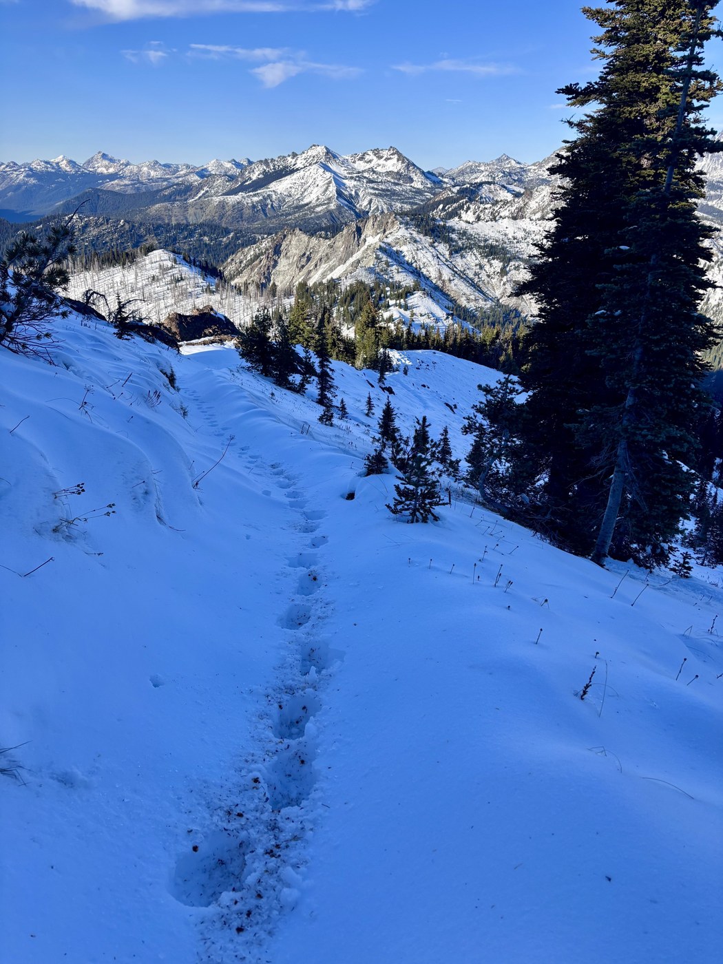 After about a mile, the Jolly Mountain trail splits left as the West Fork Teanaway trail descends toward the river, and all the way south to the West Fork Teanaway road and campground. I found this junction easy to miss when the trail is snow-covered, and the dirt bike tracks all head downhill. From here, enjoy the scenic ridge again, leading to a saddle, then a climb to a lookout point. The snow was soft in this section, but the trail was always easy to follow and never too steep to require traction.