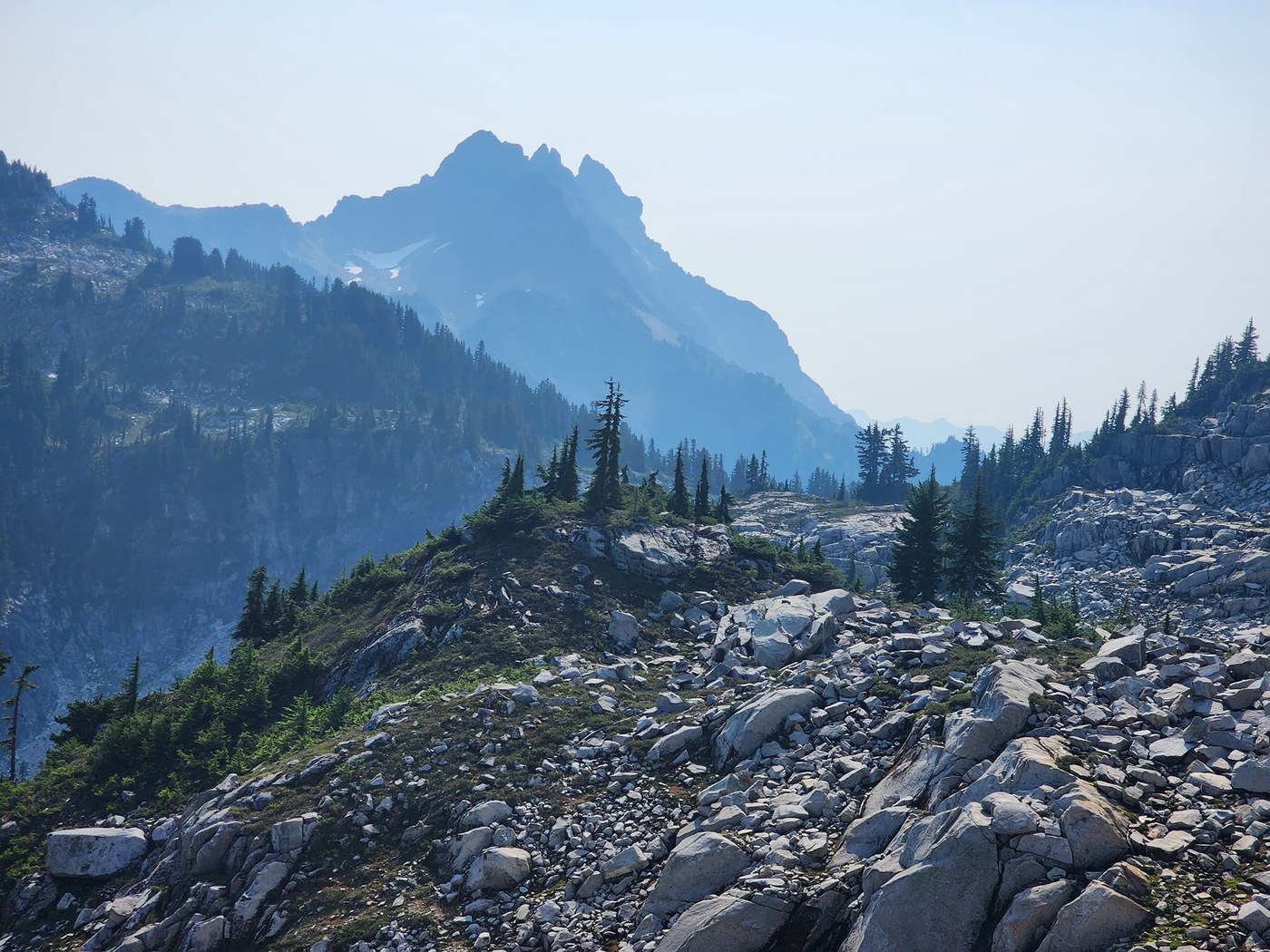 Up until this point the trail had been super obvious, well graded, and wide open with the exception of the one large blow down. Atrium Ridge was a different story with steeper up and downs, and some misleading side boot paths but nothing super complicated. This section was much more interesting and the number of people on the trail dropped dramatically. The views and scenery improved drastically as we continued (lots of exposed granite boulder areas and mini alpine meadows everywhere) and our camp spot by Chetwoot Lake was Stunning!! The Mosquitoes were out in force, so we set up our tents pretty quickly and happily ate dinner before snuggling in for the night. About 9.5 miles