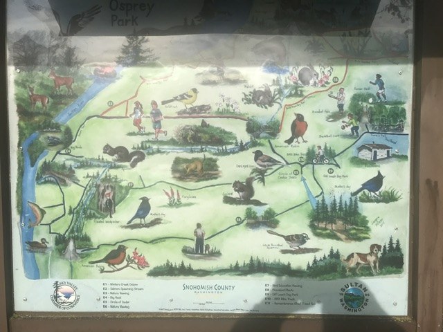 One sad note was the presence of 50-75 mature trees that are being smothered by English Ivy. Several trees have already been killed. The purpose of this note is to let the landowner know of this issue. This is an invasive species and the vertical vines flower to spread seeds to other forested areas. South end of river trail. (47.86260, -121.82467)