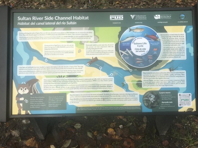 One of the features of the park is a new “side channel” habitat was restored in 2024 and provides habitat for salmon and other wildlife. I did see a couple salmon looking down from one of the bridges.