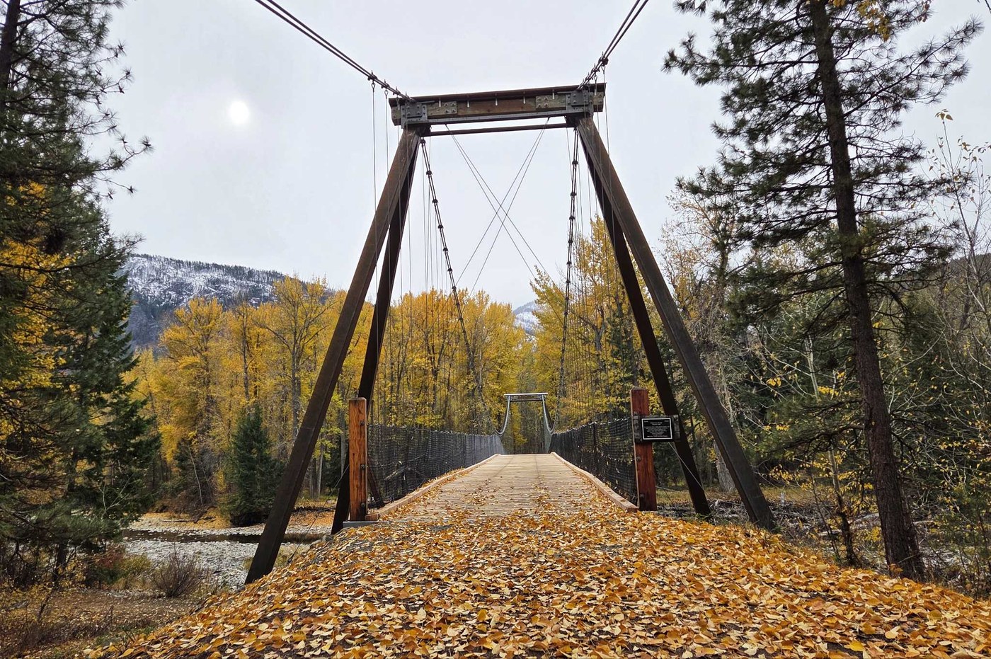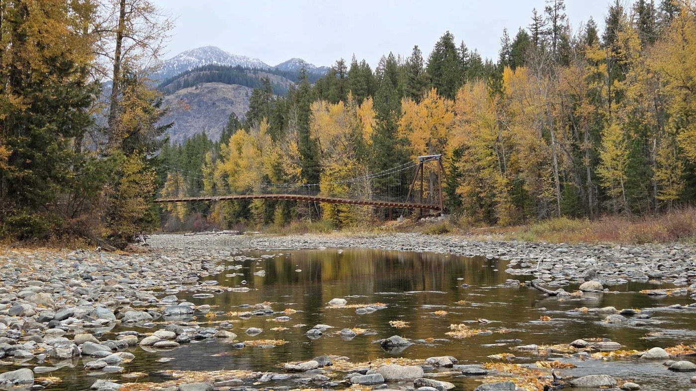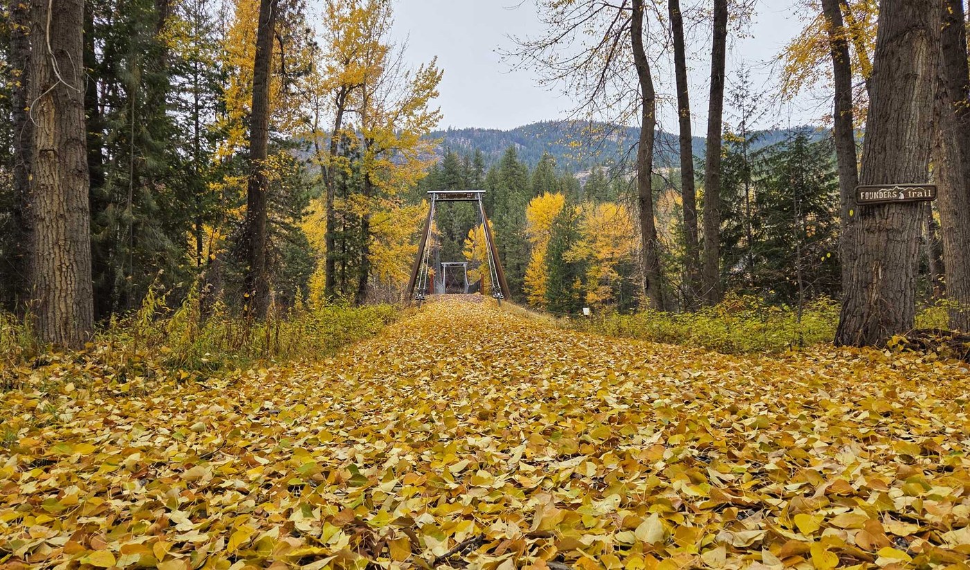 Though WTA lists this as an 18 mile trail, many/most people just walk (or cycle) segments of it. The walk from the suspension bridge trailhead to and a bit past the actual bridge is wonderful right now. The trail is carpeted with yellow leaves and there is still a significant amount of fall foliage on the trees.