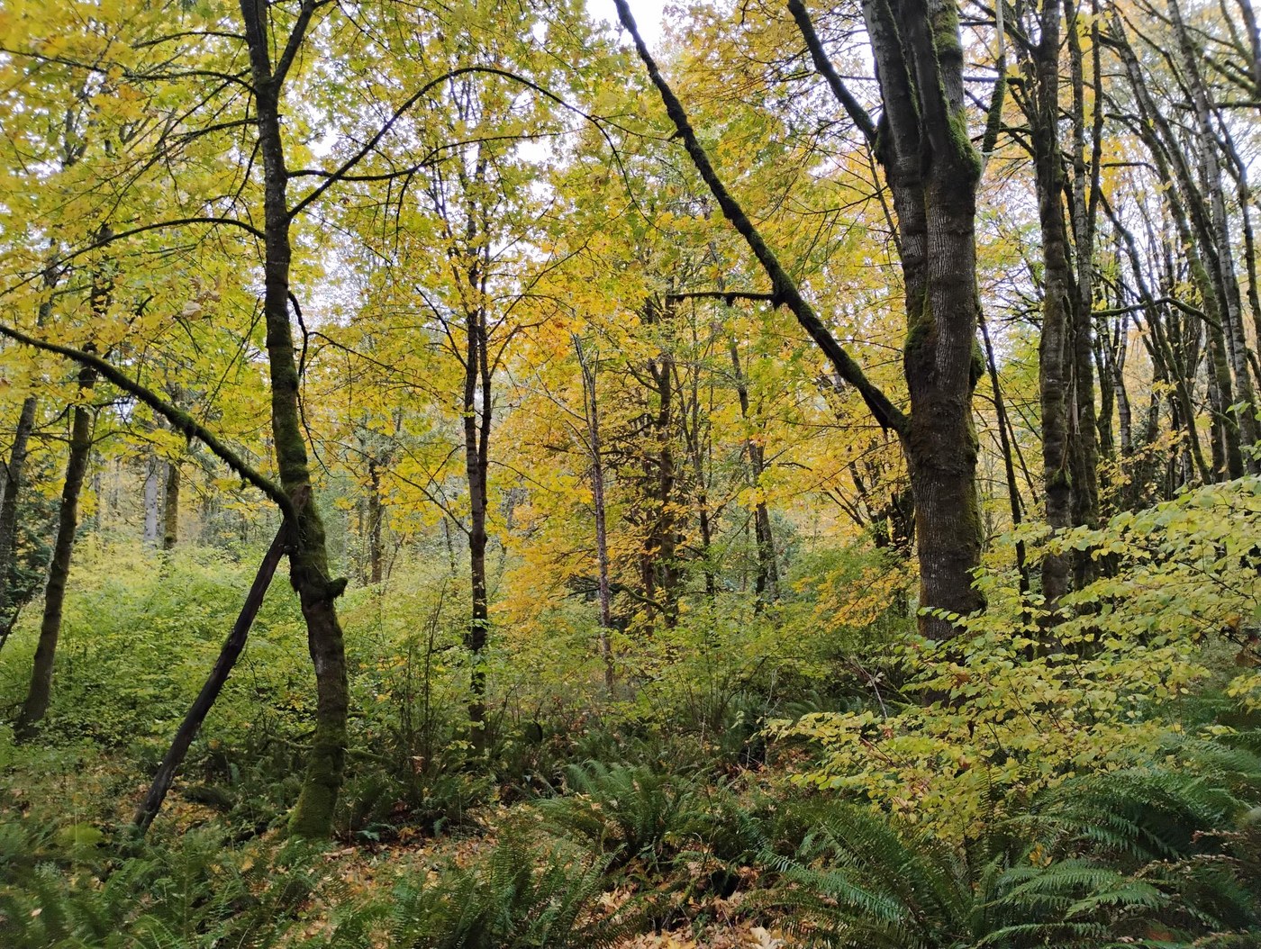 Time of year to start hiking the Issaquah Alps more...this is one the loops I enjoy from Sky Country trailhead. This time we did it counterclockwise, starting with the downhill along the Cave Hole trail, past Coal Creek Falls (almost dry), up to Quarry trail, down to Indian Trail, up Shy Bear with lunch on the bench at Far Country Lookout, and return via Fred's Railroad and By Pass. All trails in good condition with no blowdowns and no mud either. Rained almost the whole time but that sort of made the fall colors glow more. Except for a couple trail runners at the very start we saw only 2 other people the whole way.