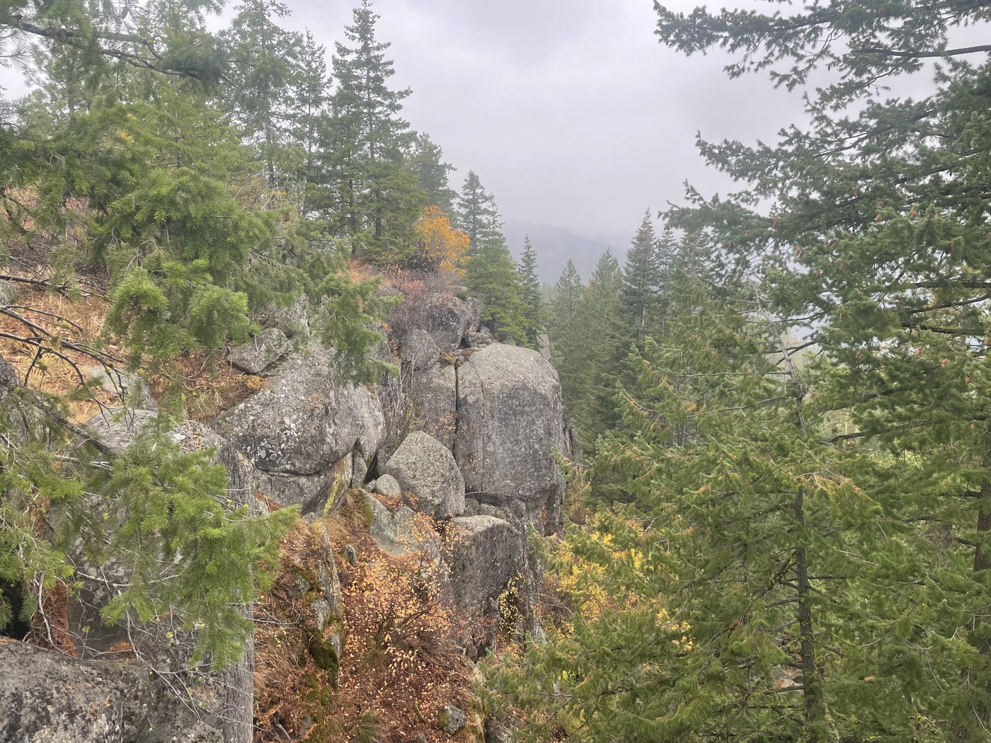 Where the road ends at the top of the ridge, turn right and continue in open, thinned forest. There are good views from the bouldery summit, but not today.