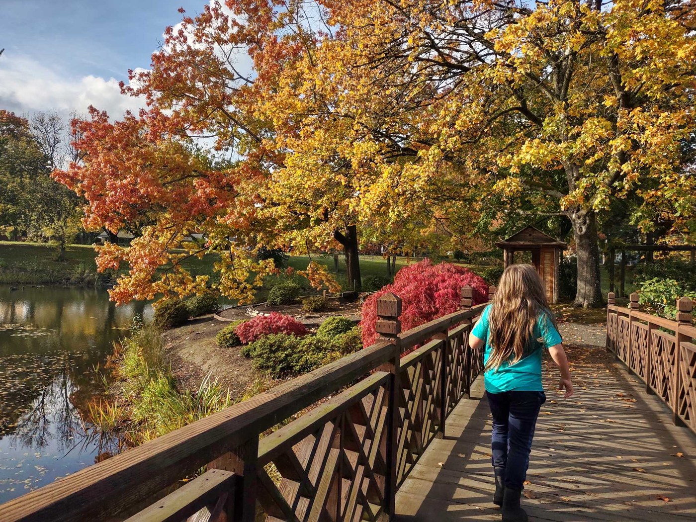 The colors are beautiful everywhere but definitely peaked in the Japanese garden which is situated on an island in the lake. The island does not allow dogs (we took turns), and closes at 3:30pm (we barely made it). The rest of the park is dog friendly and they will be thrilled with all the geese, ducks, and squirrels.