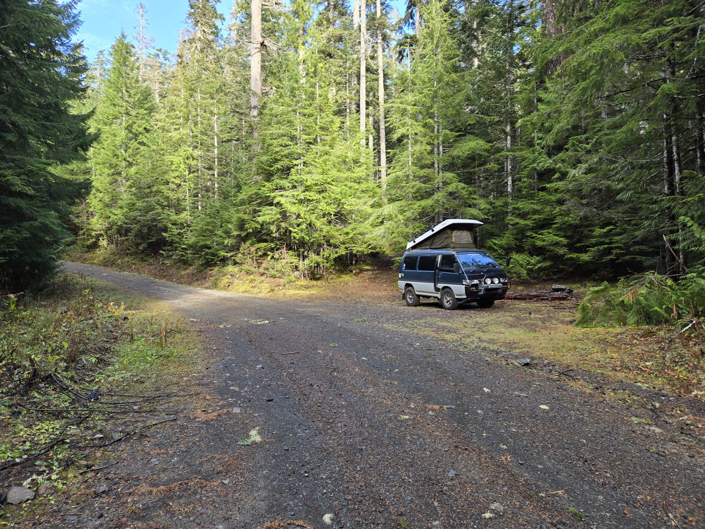 We took the trail to Satsop Lake from the west trailhead. I had not driven road 2372 from the northwest end for 20 years, and my companion longer than that. It had been in pretty rough shape back then, why I never went back, always approaching Satsop Lake from the southeast, from the Satsop Center. Well that route is impassable now, so I was surprised to learn that the Mountaineers had gone to the lake, taking 2372 from the northwest. That road, now, is about as good as a secondary Olympic road gets. It's had work. A few water bars, but nothing like the ones on the road to the east trailhead. A few places that get some rock fall, but again, nothing like the east trailhead. I would not say that just any vehicle could do it but absolutely no trouble in a Forester. And when we got to the trailhead, there was a Japanese Domestic Market camper van! he made it.