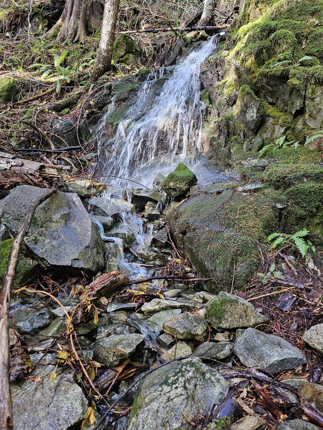 We headed across the road with the intention of doing the calm CCC, as we're nursing some injuries. The winds seemed to be calmer here than the drive in. This area was so green as the light hit the moss and ferns. Lots of fungi too! After getting up to the CCC, we took the unmarked trail up to the Nordrum Lookout and kept going. We didn't know how far we were going, but just went with it. We kept checking our mileage, but we weren't getting far for the elapsed time. Maybe our trackers were off. It turned out to be a short mile to a viewpoint, with an option to go to Quartz Ridge. Apparently, the mile climb gained 1400 feet, so that explained things. We just did the endpoint, which had views of the Middle Fork valley with Thomson in the background. The trail was mostly clear and well-defined except for a few extra-ferny sections where it was hard to see the roots and a few rocks. We headed back down and did a bit of the CCC, then over to the Middle Fork Trail. There were so many folks out today, we had seen just 2 on the CCC and none above that.