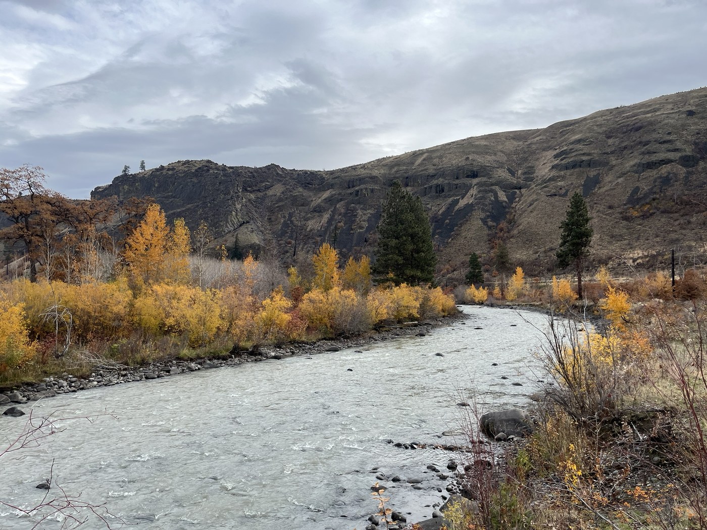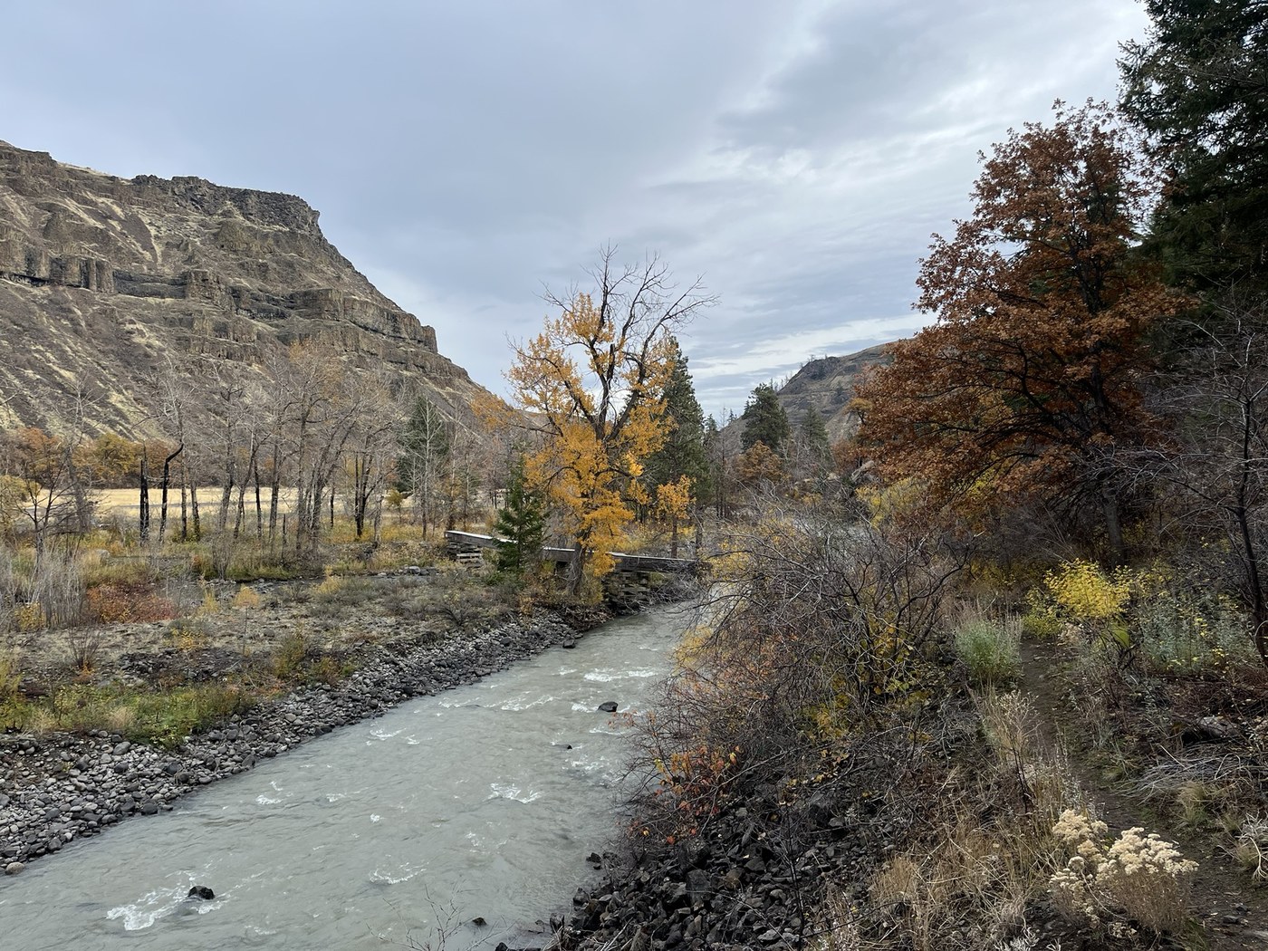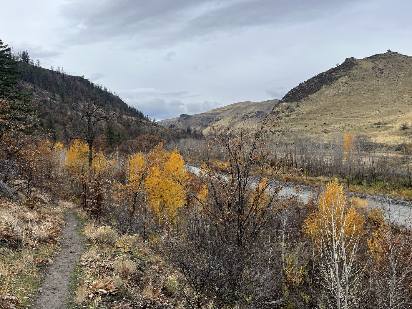 One of my favorite fall hikes in Washington, I seem to always come here at the tail end of the color. My first time hiking here since the Retreat Fire in 2024 and the Yakama tribe’ channel restoration in February 2025. The first mile or so is the same as I remembered, sagebrush flats with a few garry oak and cottonwoods along the river. Lots of great views and fall colors. Past the suspension bridge (if hiking upriver from the wildlife feeding station) damage from the fire becomes more evident, lots of charred trees but also signs of new life. Some parts of the trail are overgrown and difficult to follow as the Yakama Nation’s channel restoration project has changed the floodplain. Will be interesting to see how this landscape evolves as the river flows through its new channel and the forest recovers after the wildfire.